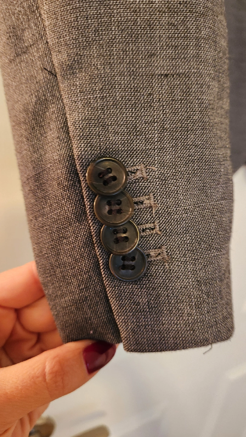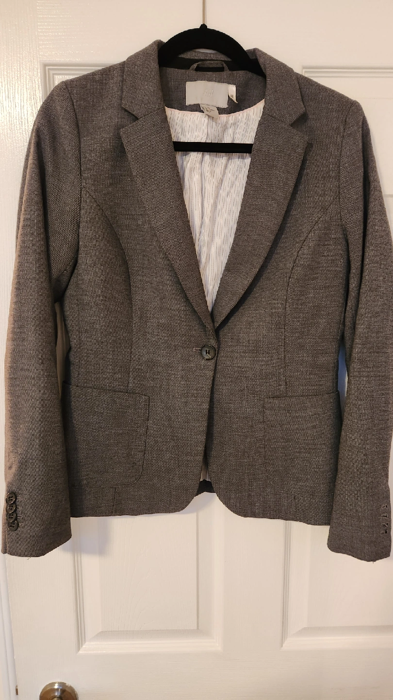 Gray with fine pin stripes,H&M blazer in size 10. Single button, flat front pockets. It's a stylish blazer with a classic look.