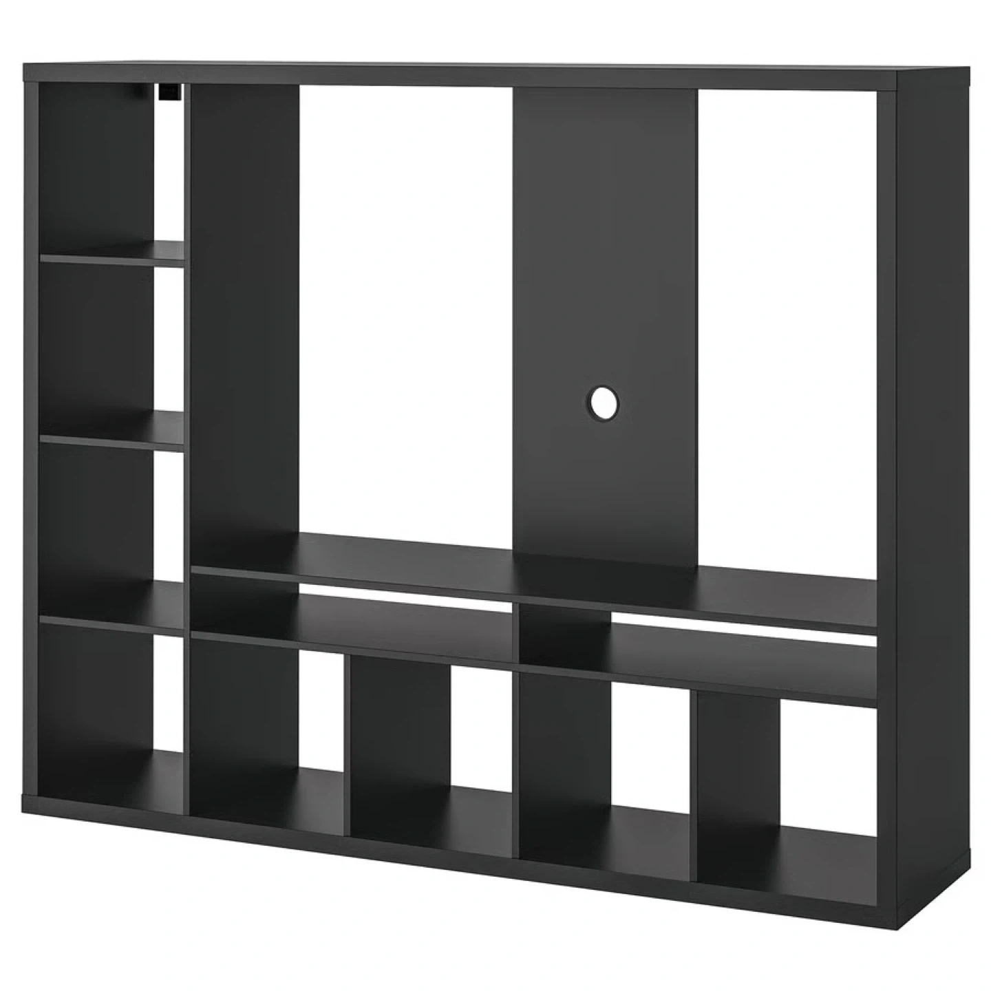 This black Ikea Lapland media console offers ample storage with multiple shelves and compartments. It's designed to hold TVs up to 60 inches and a maximum weight of 25 kg. The unit measures 183 cm wide and 147 cm tall.