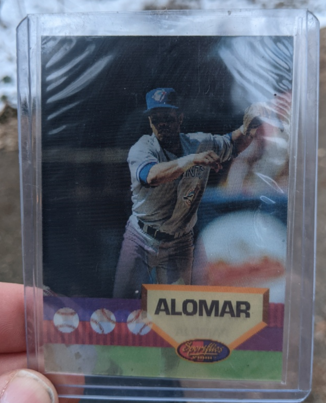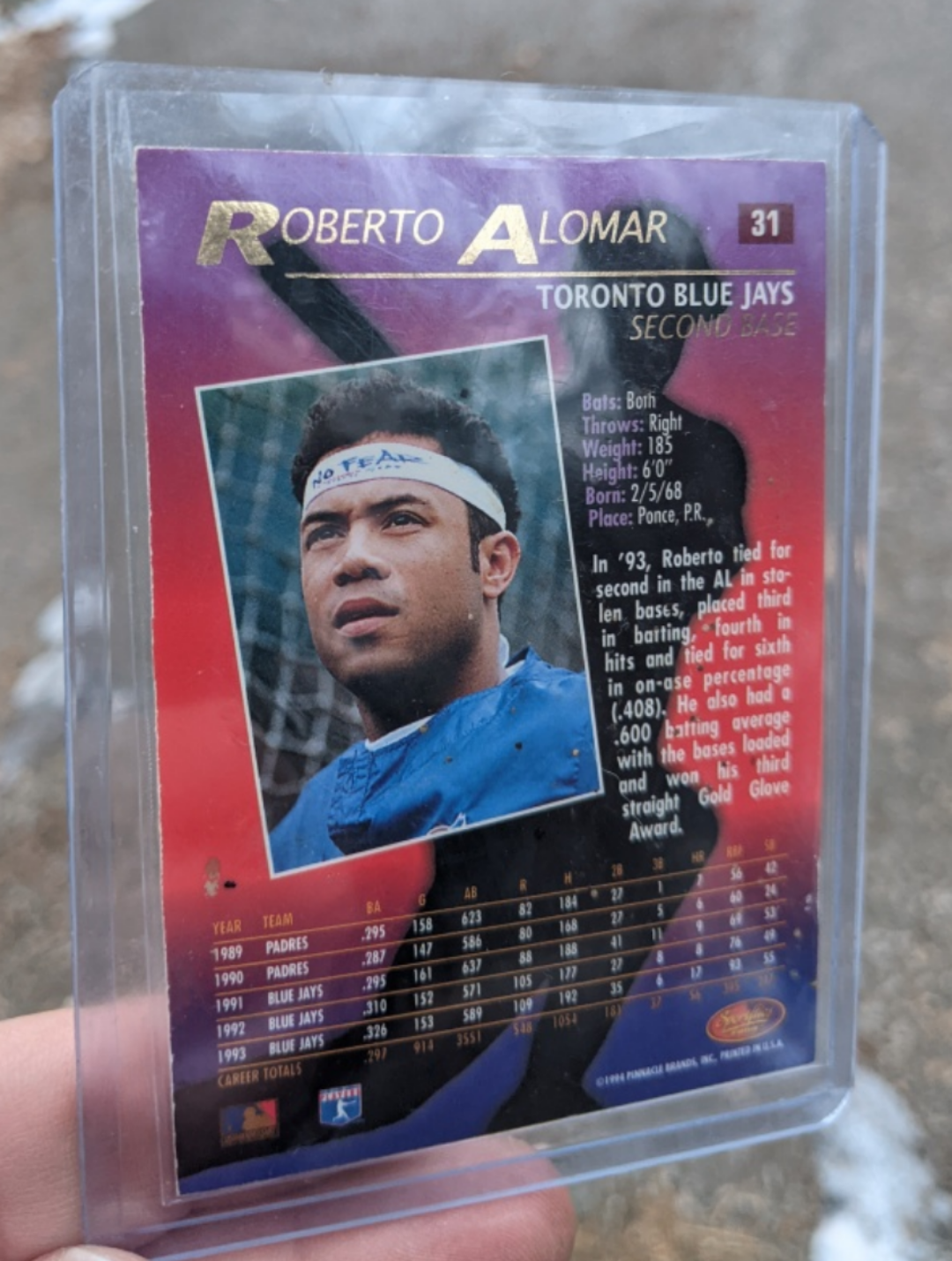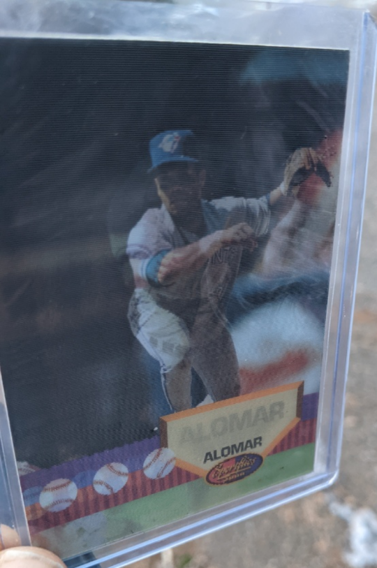 Vintage baseball card. Features Roberto Alomar. Toronto Blue Jays. Card in a protective case. Shows some wear.