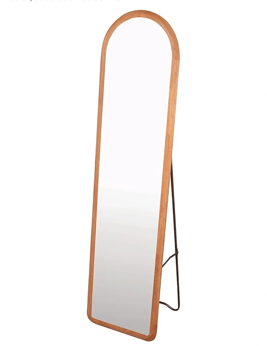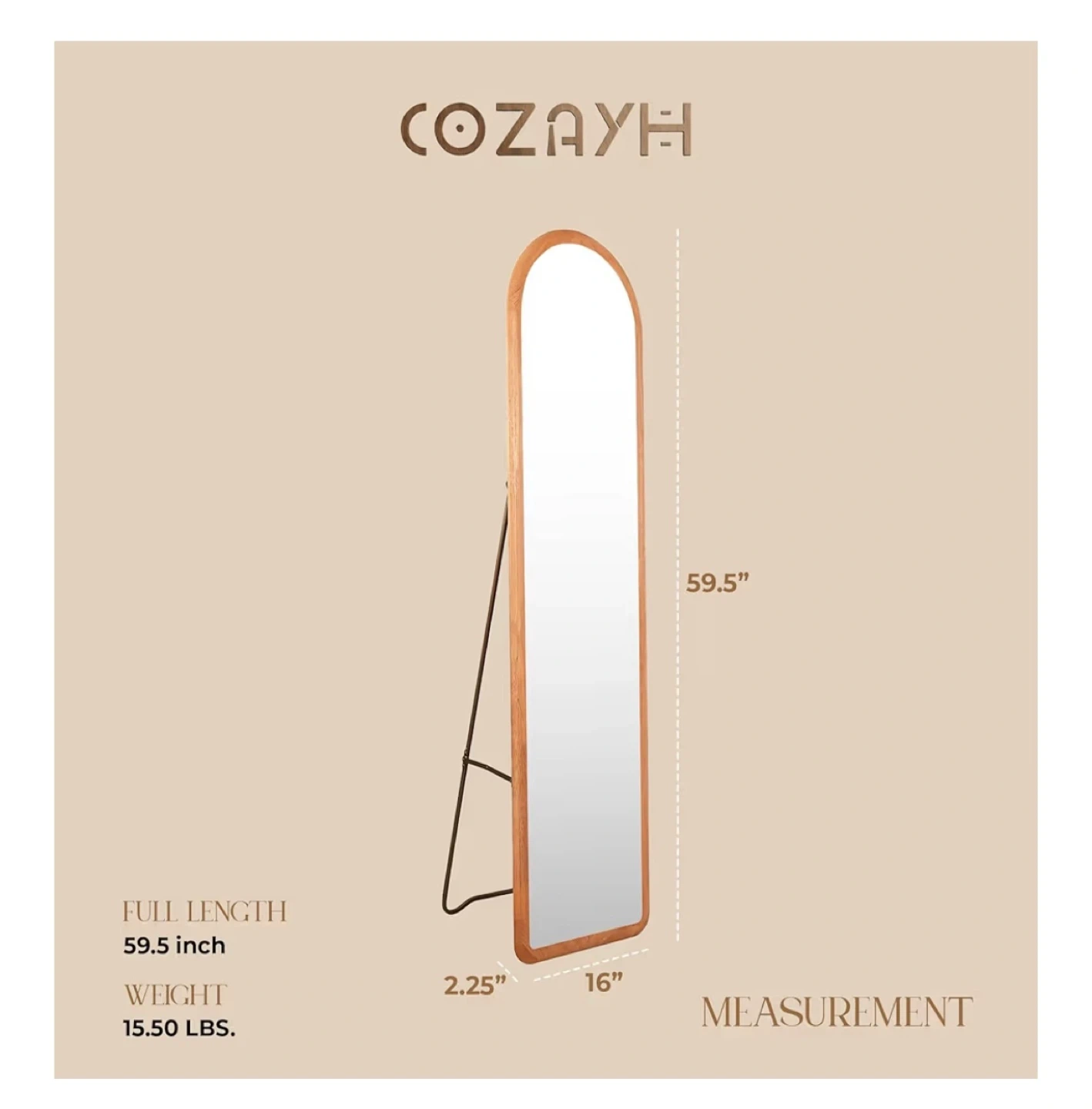 This is a COZAYH full-length arched mirror. It features a durable solid wood frame and shatterproof eco glass. The mirror offers versatile display options: stand, lean, or mount to fit your space.
