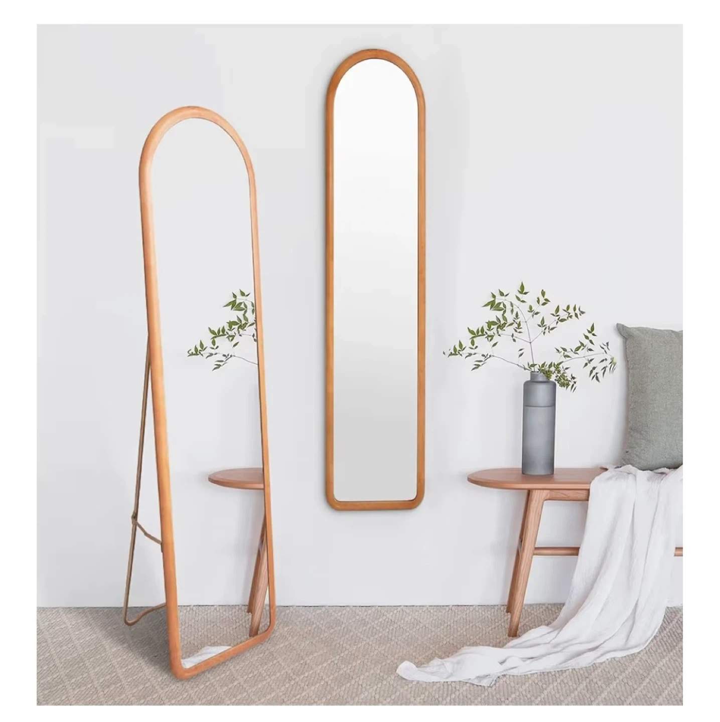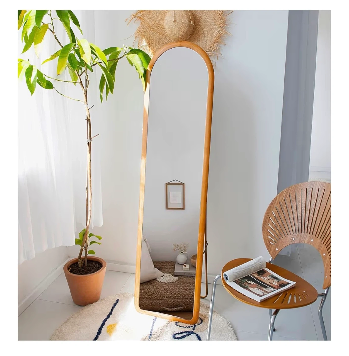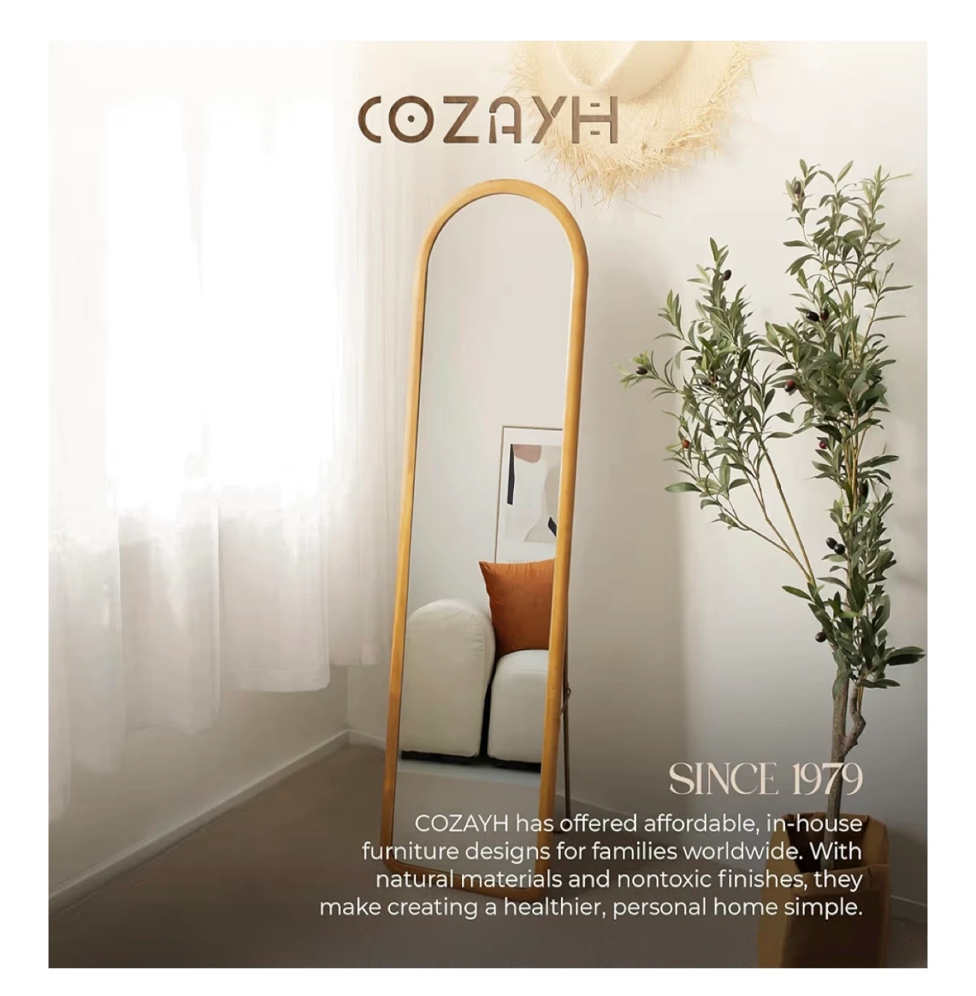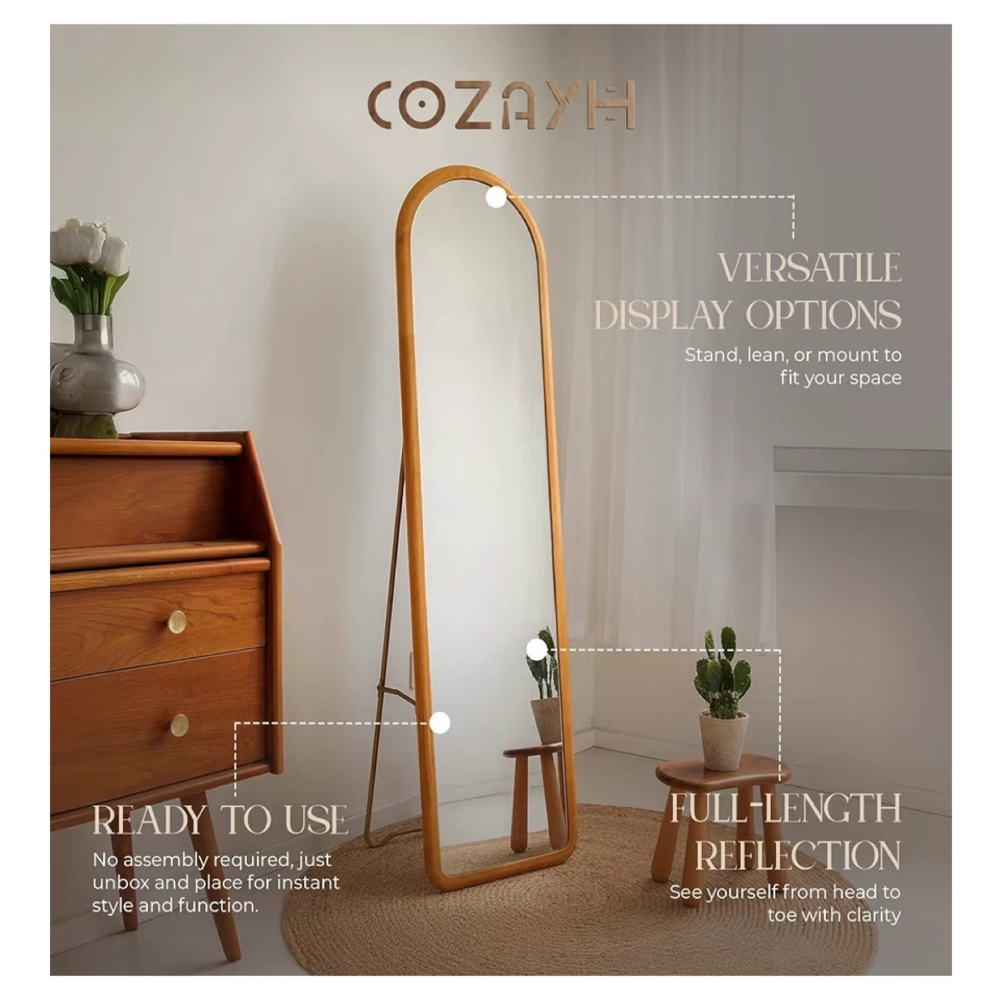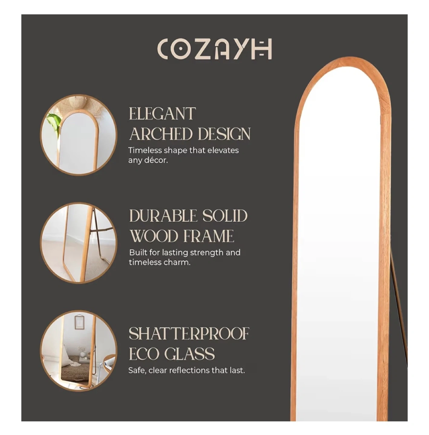 This is a COZAYH full-length arched mirror. It features a durable solid wood frame and shatterproof eco glass. The mirror offers versatile display options: stand, lean, or mount to fit your space.