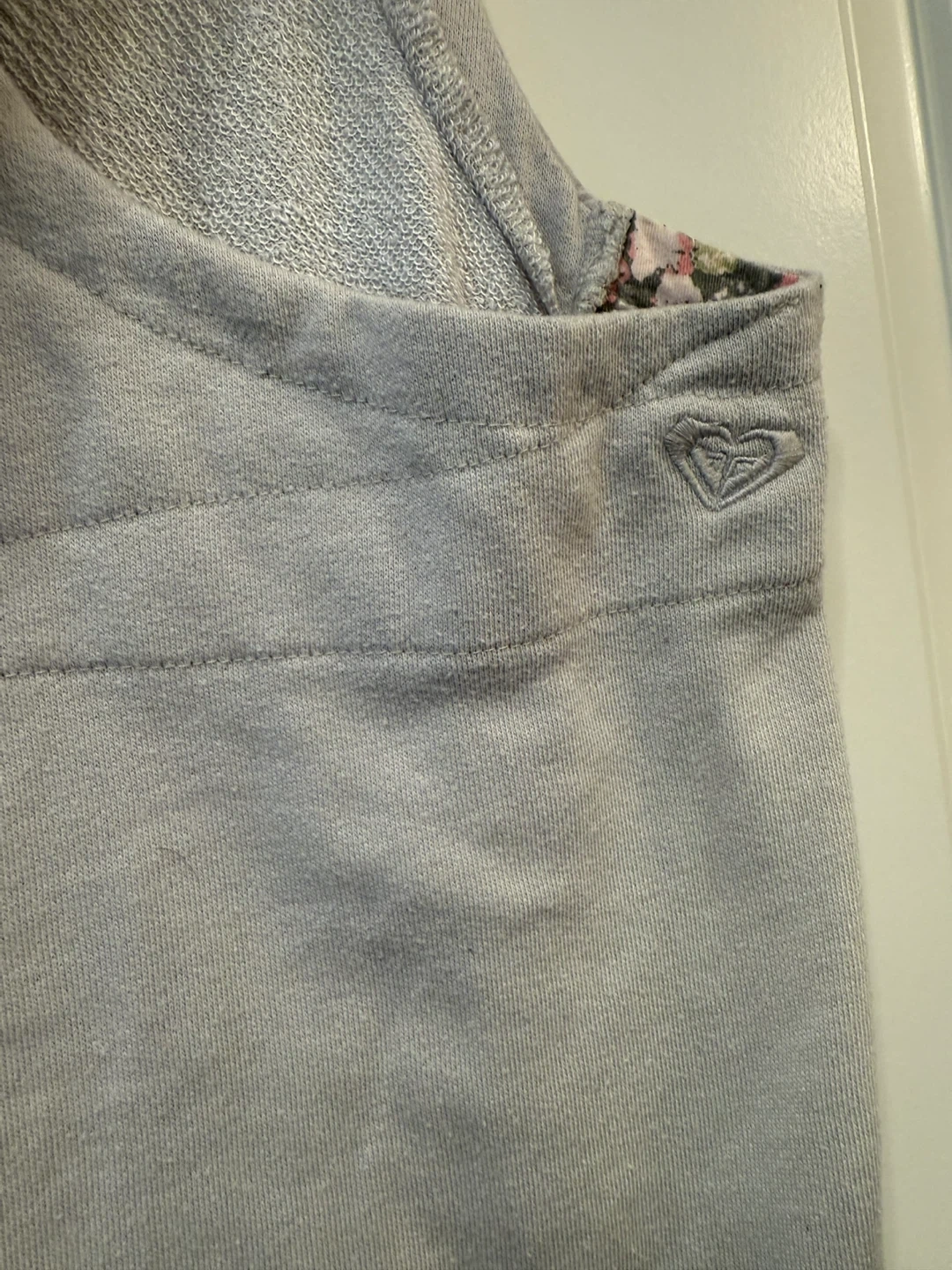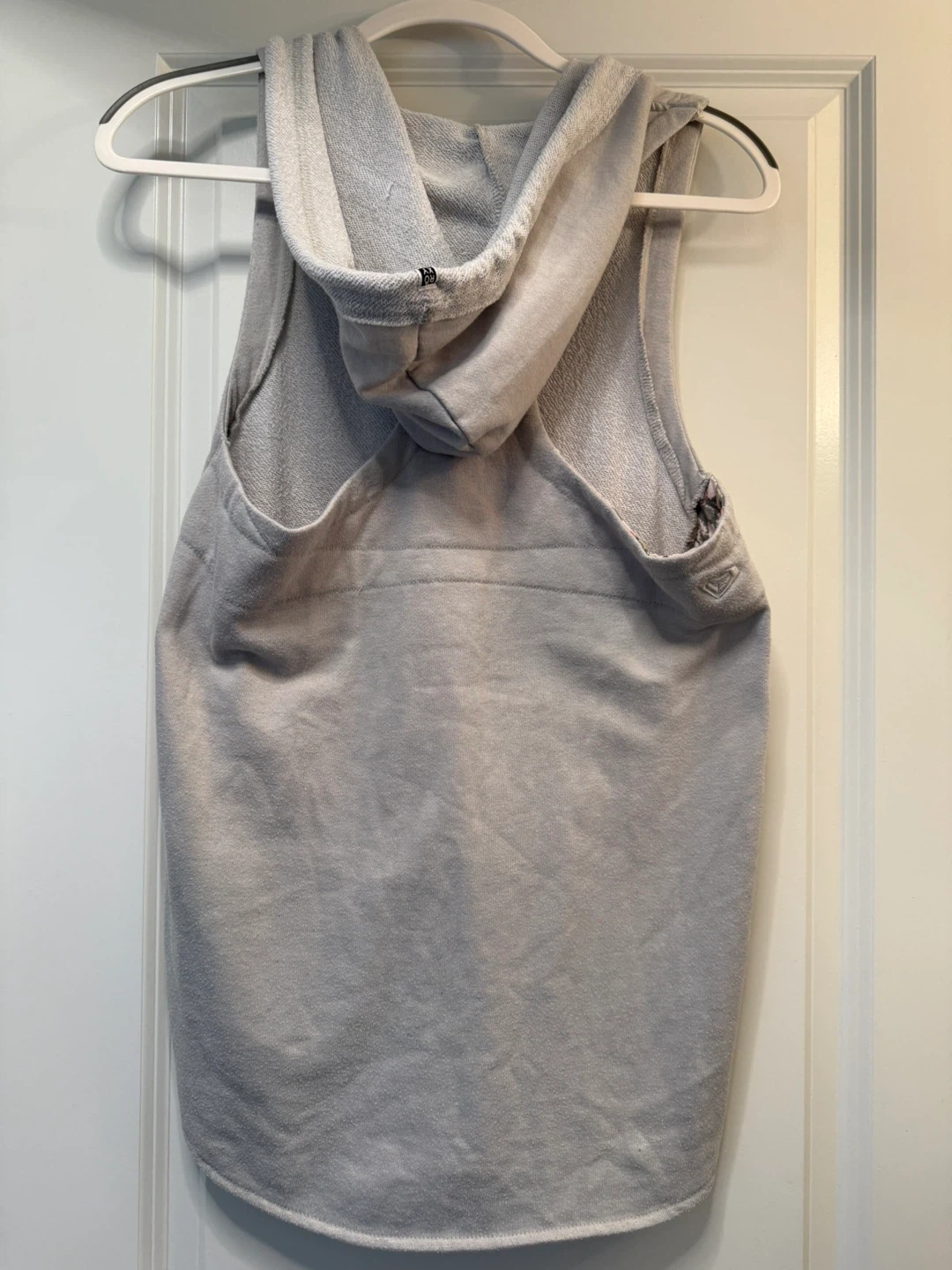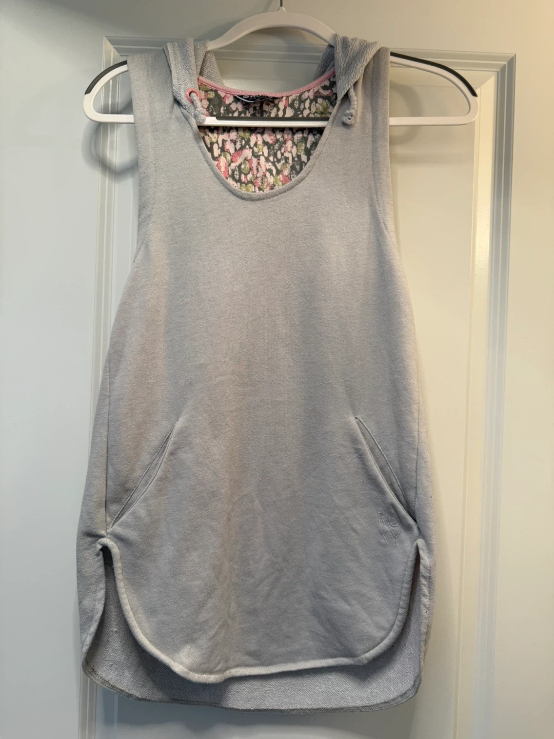 Selling a Roxy sleeveless hoodie in a lovely grey colour! It features low side cuts and a cute floral pattern on the inside of the hood. Perfect for layering or wearing on its own anytime of the year. Made out of cotton, polyester and rayon it gives this piece a super soft and comfortable feel!