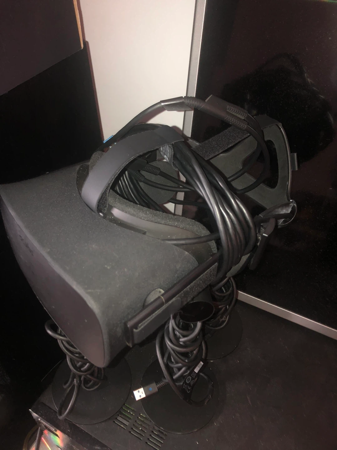 Complete Oculus Rift virtual reality set. Includes the headset, two controllers, and four tracking sensors. Everything you need to jump into VR! All cables are included.