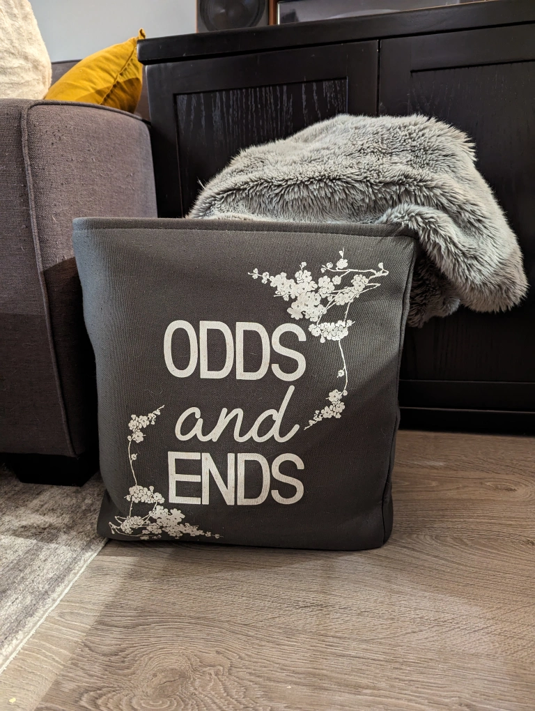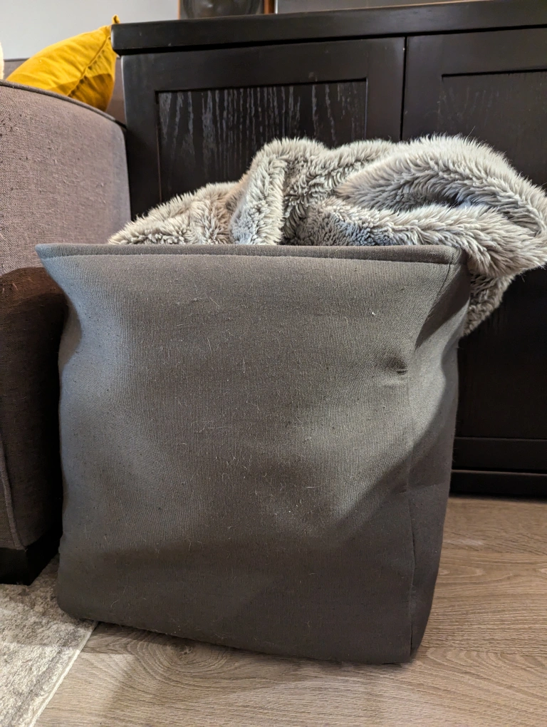 I have this cute grey storage bin available. It's great for storing extra blankets, but could also be used for toys or anything else you need to tidy on the regular.
