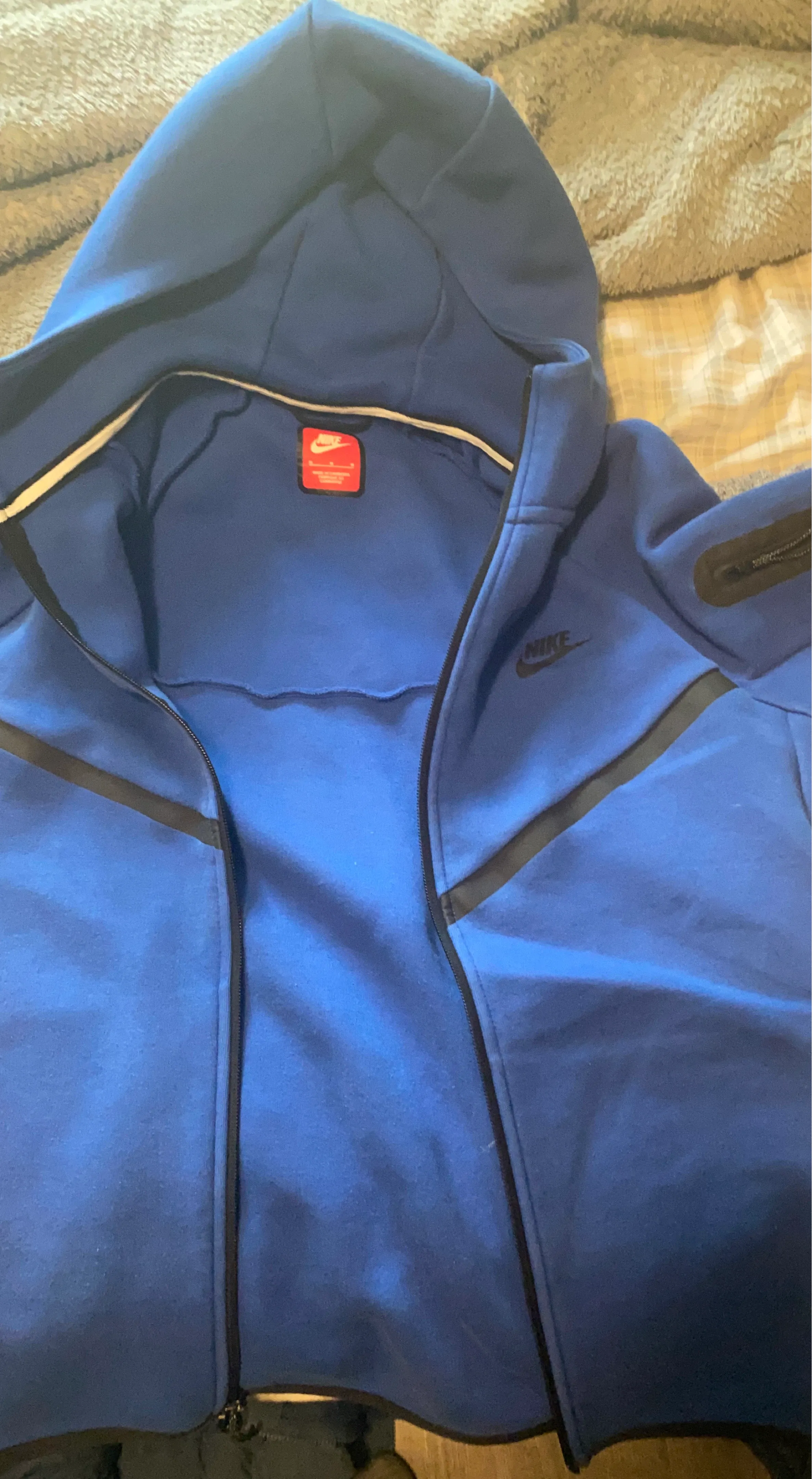 Nike Tech Fleece full-zip hoodie in blue. Zip pockets on sleeves. Hood with drawstrings. It's made of a polyester blend. Great for cooler weather!