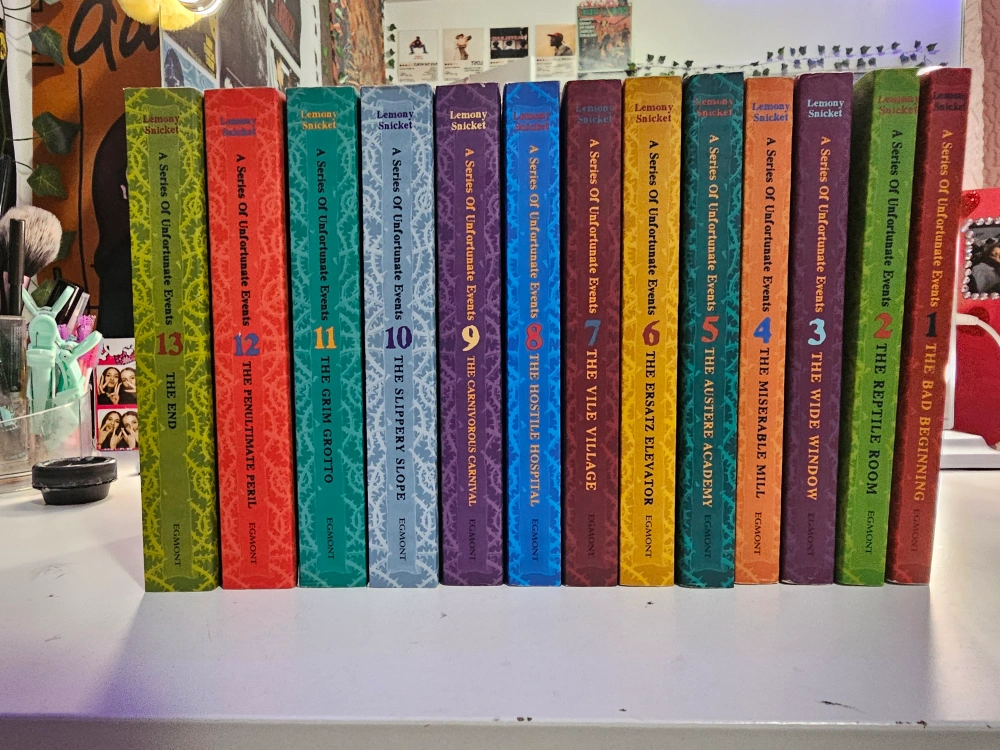 A complete collection of books from the series. The spines show off different colours. Each book's title is visible. Curl up with these books to relax after a long day. Also very interesting for those who dont like reading