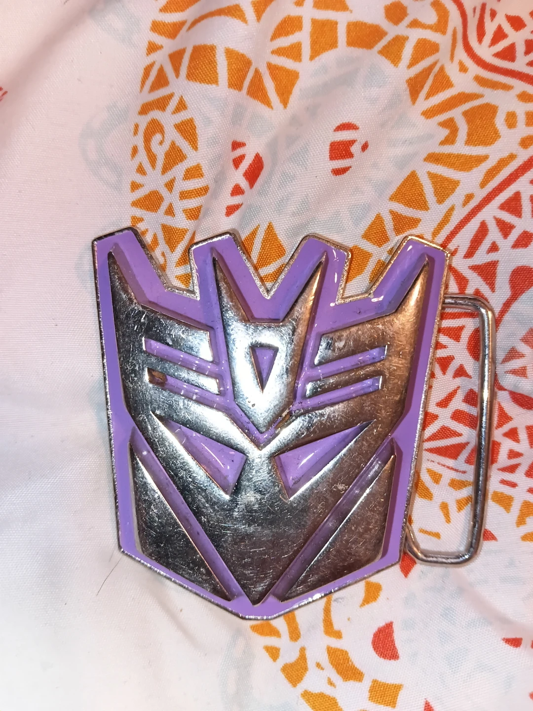 This is a purple and silver Transformers Decepticon belt buckle. It's made of metal and features the iconic Decepticon logo. A great accessory for any fan!