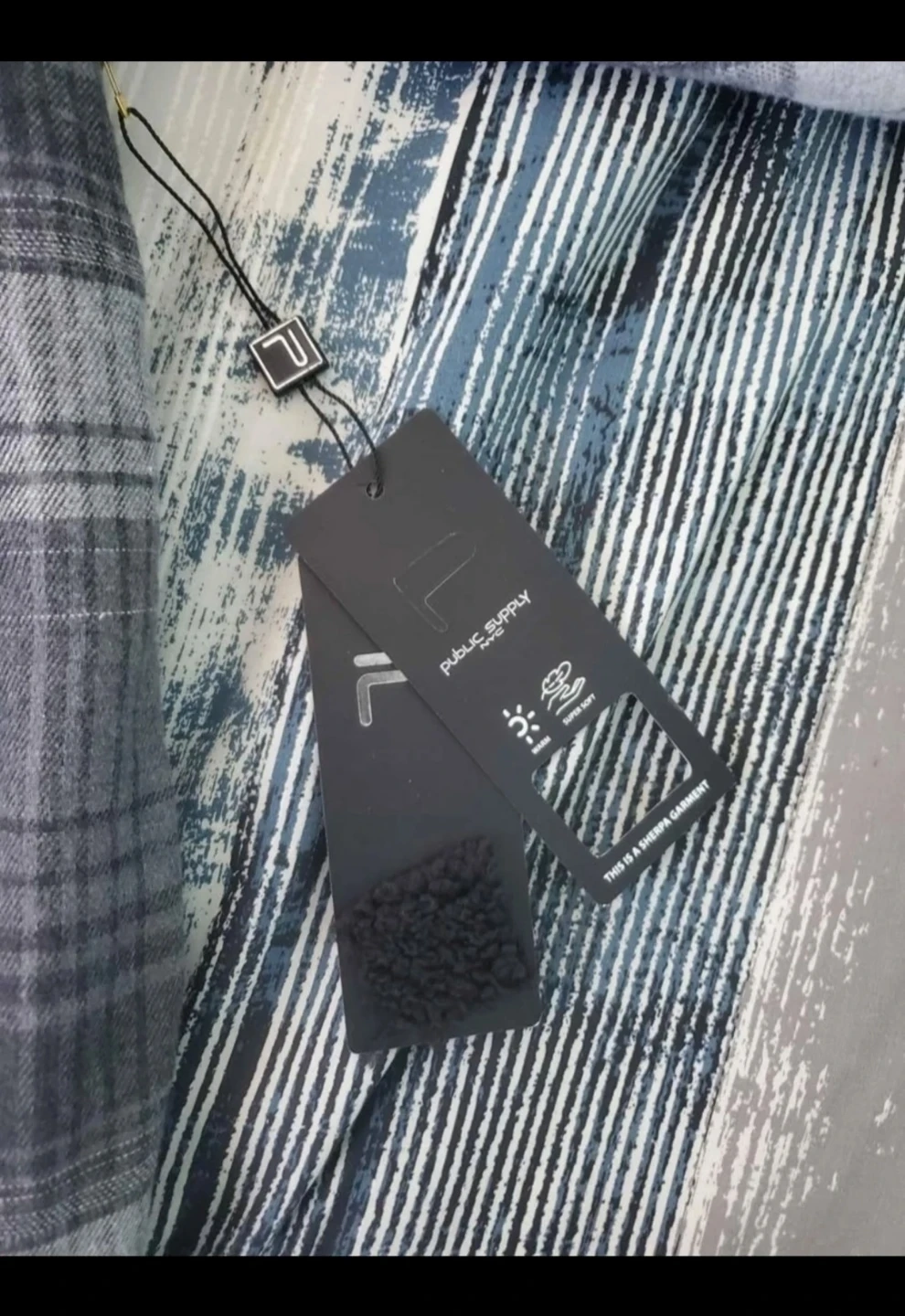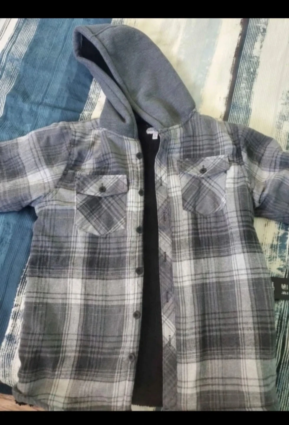 Cozy sherpa-lined flannel shirt jacket with a contrast hood. Features two chest pockets and button-up closure. It's designed for warmth and comfort. Grey and white plaid pattern. Fleece-lined interior. Button closure. Size (L) youth (14-16).