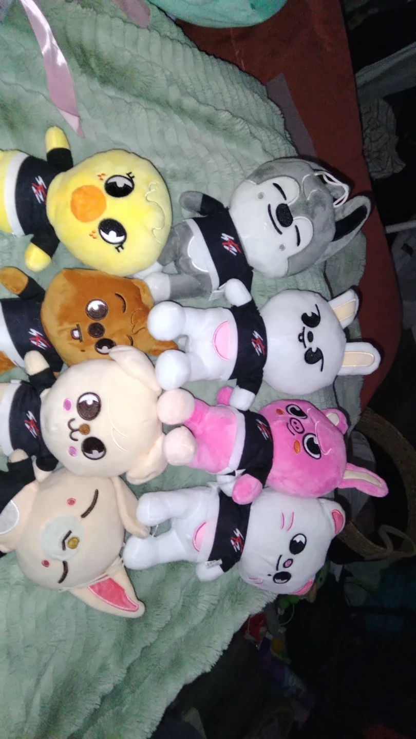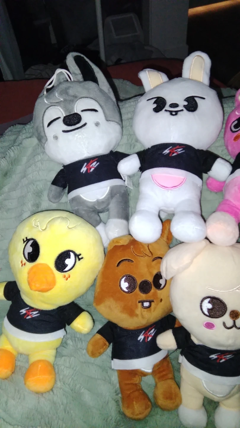 A collection of SKZOO plush toys, featuring characters inspired by Stray Kids members. Each plush is made of soft material and wears a black shirt with a white and red logo.