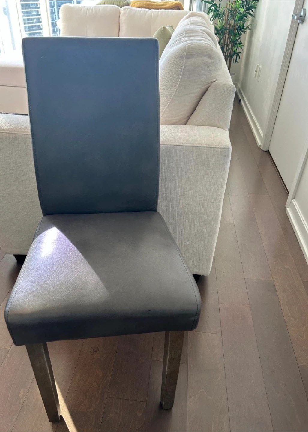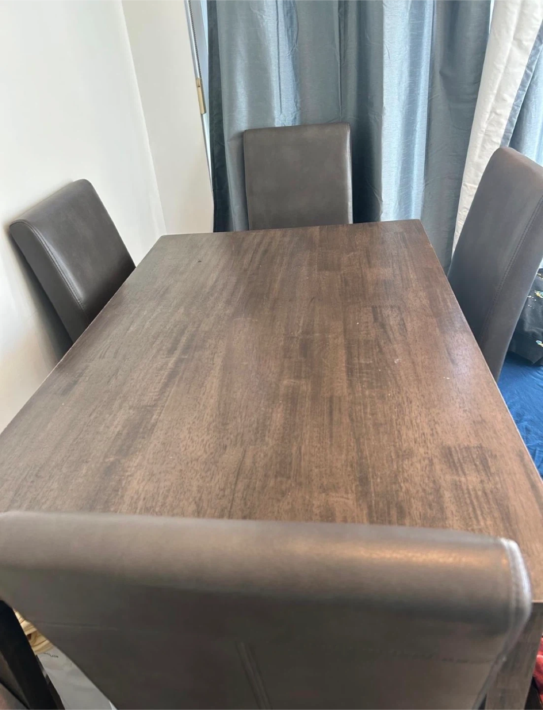 Selling a dining set with table and 4 grey leather chairs. It's in great shape and would look great in any dining room!