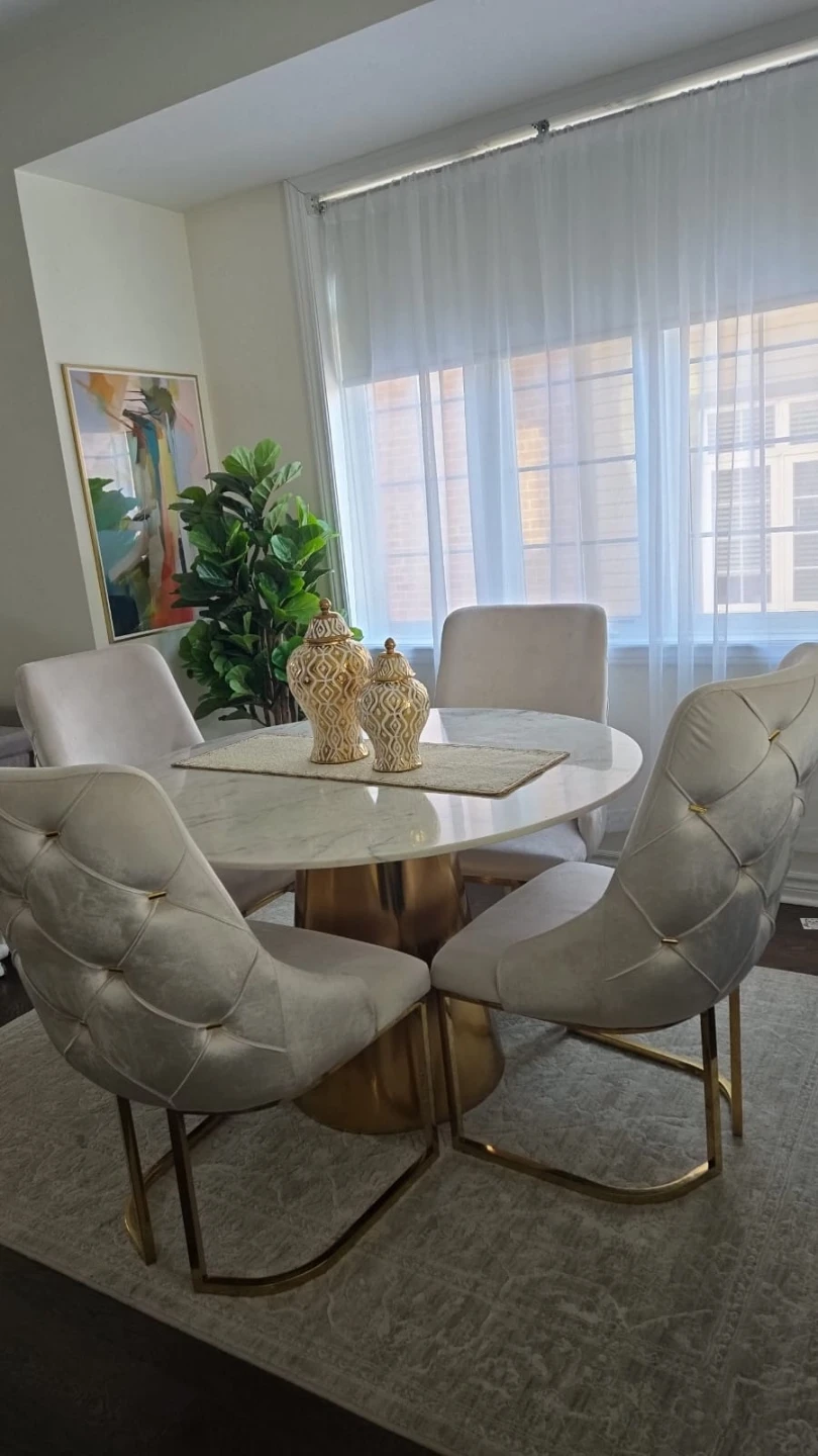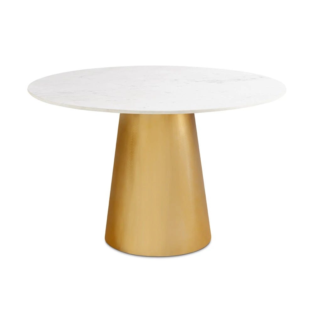 This dining table features a white marble top with a gold pedestal base. It's perfect for a kitchen or dining area. The table's design offers a modern aesthetic. It provides ample space for intimate gatherings.