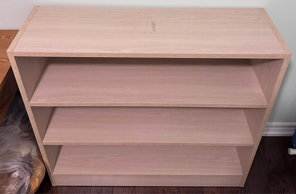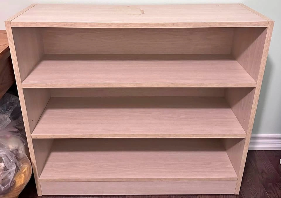 Selling a 3-shelf bookshelf with a light wood finish. Sturdy and functional, perfect for books, decor, or storage. Has some minor cosmetic damage (as shown in photos), but overall in good condition—priced accordingly. Great for home, office, or dorm. Move-out sale – must go. Asking $40. Pickup only.
