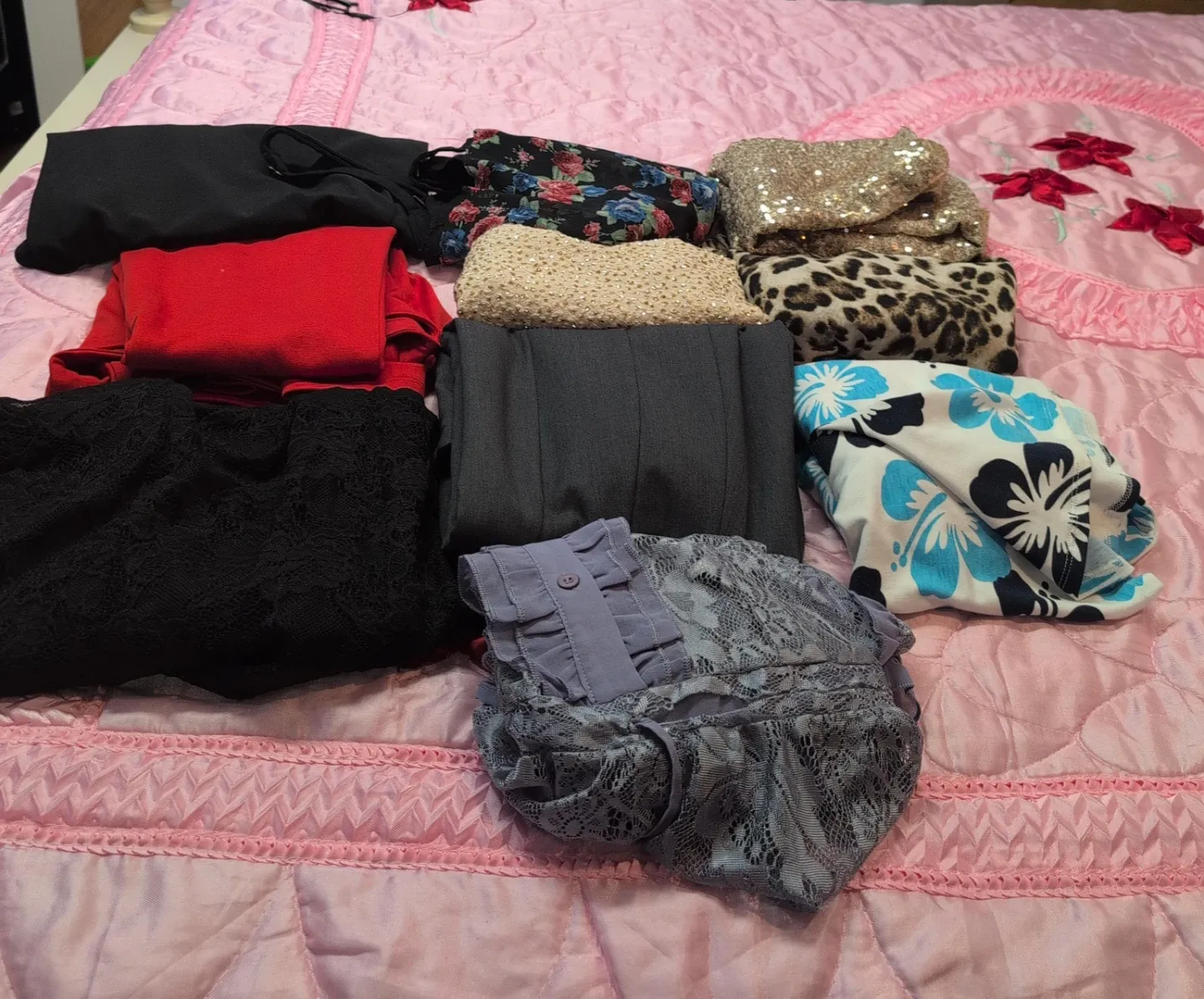 Bundle includes a black lace dress, a red top, a black sleeveless top, and a floral print blouse. Also contains a sequined gold top, a leopard print top, a grey skirt, and a light purple lace top. Material varies.