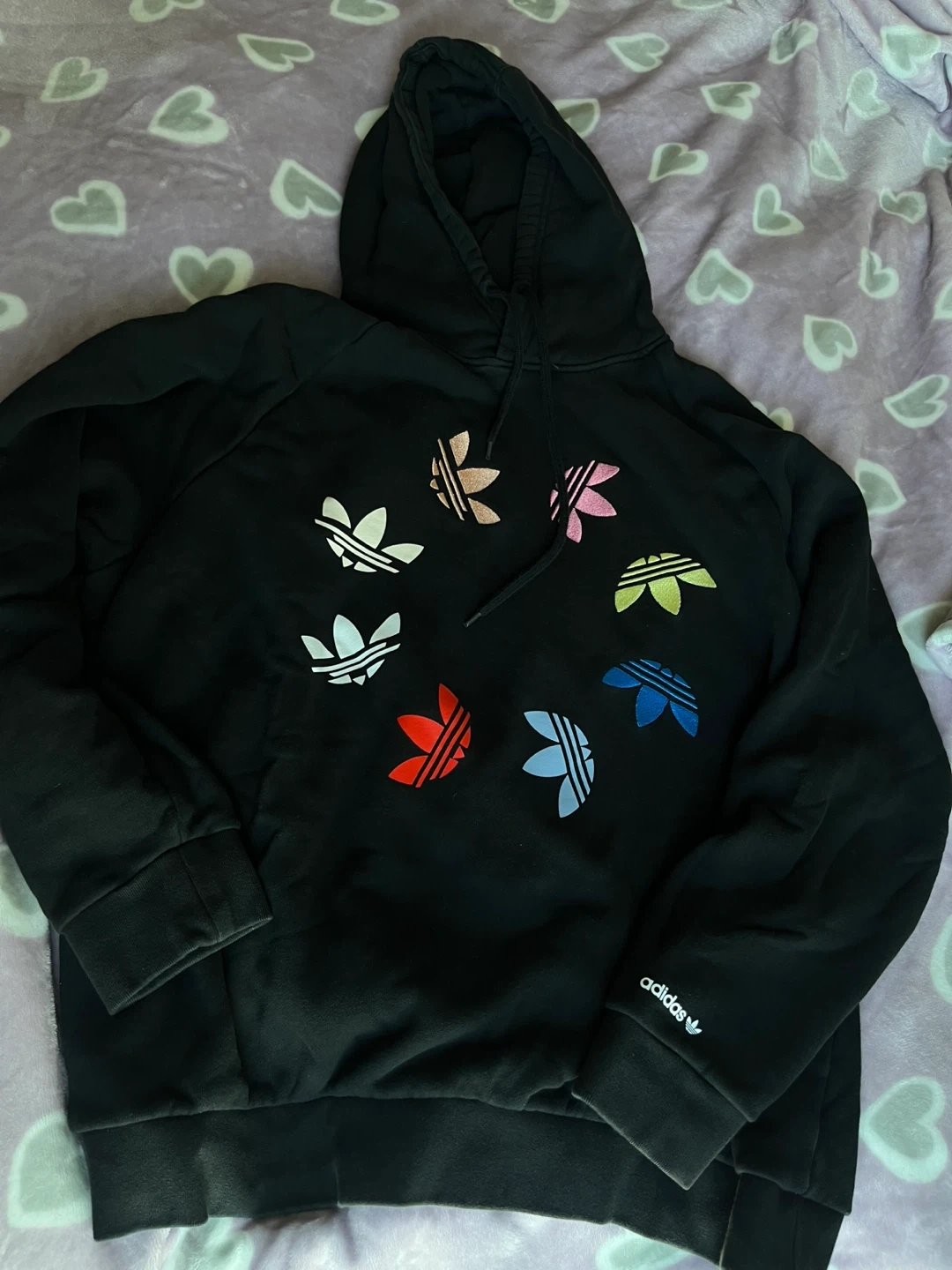 This is a black Adidas hoodie featuring the iconic Trefoil logo in multiple colours. It's in great condition and perfect for everyday wear. The hoodie is comfortable and stylish, making it a great addition to your wardrobe!