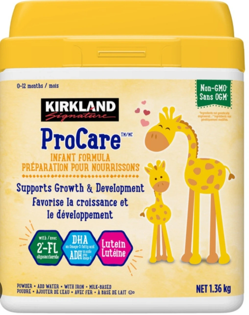Kirkland Signature ProCare infant formula powder. Supports growth and development. It's milk-based with iron, 2'-FL oligosaccharide, DHA, and Lutein. For babies 0-12 months.