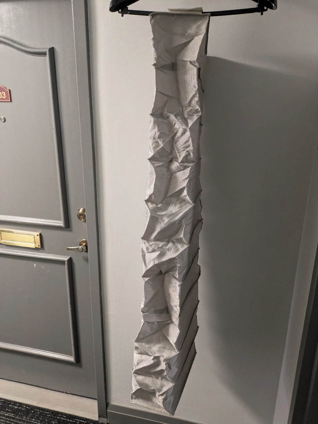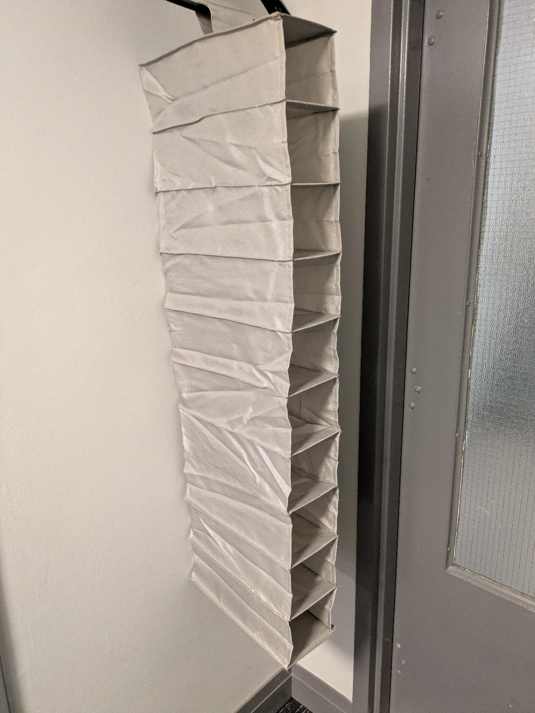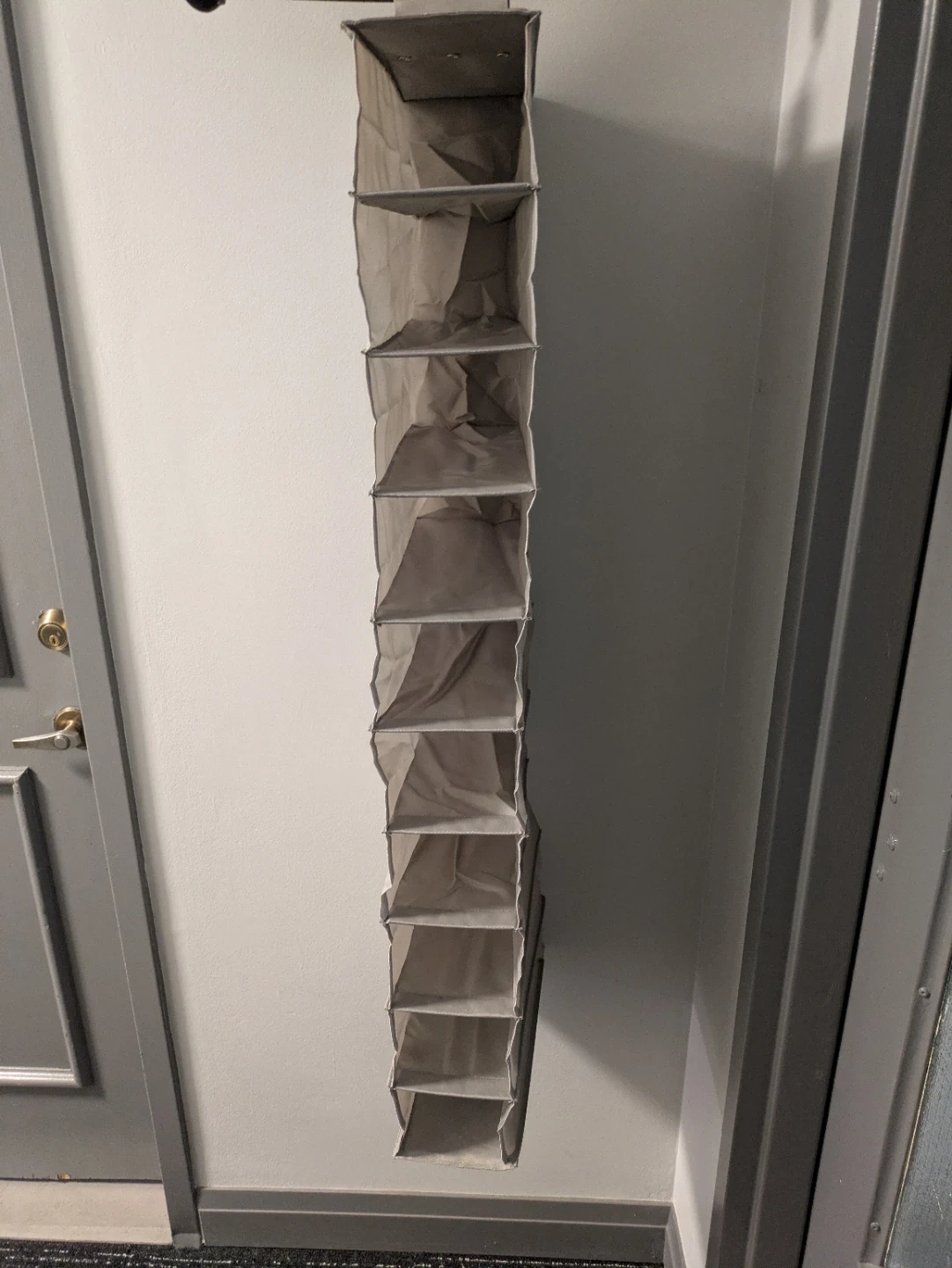 This is a hanging fabric organizer with multiple shelves. It's made of a grey, textured fabric. Ideal for storing shoes, accessories, or other small items.