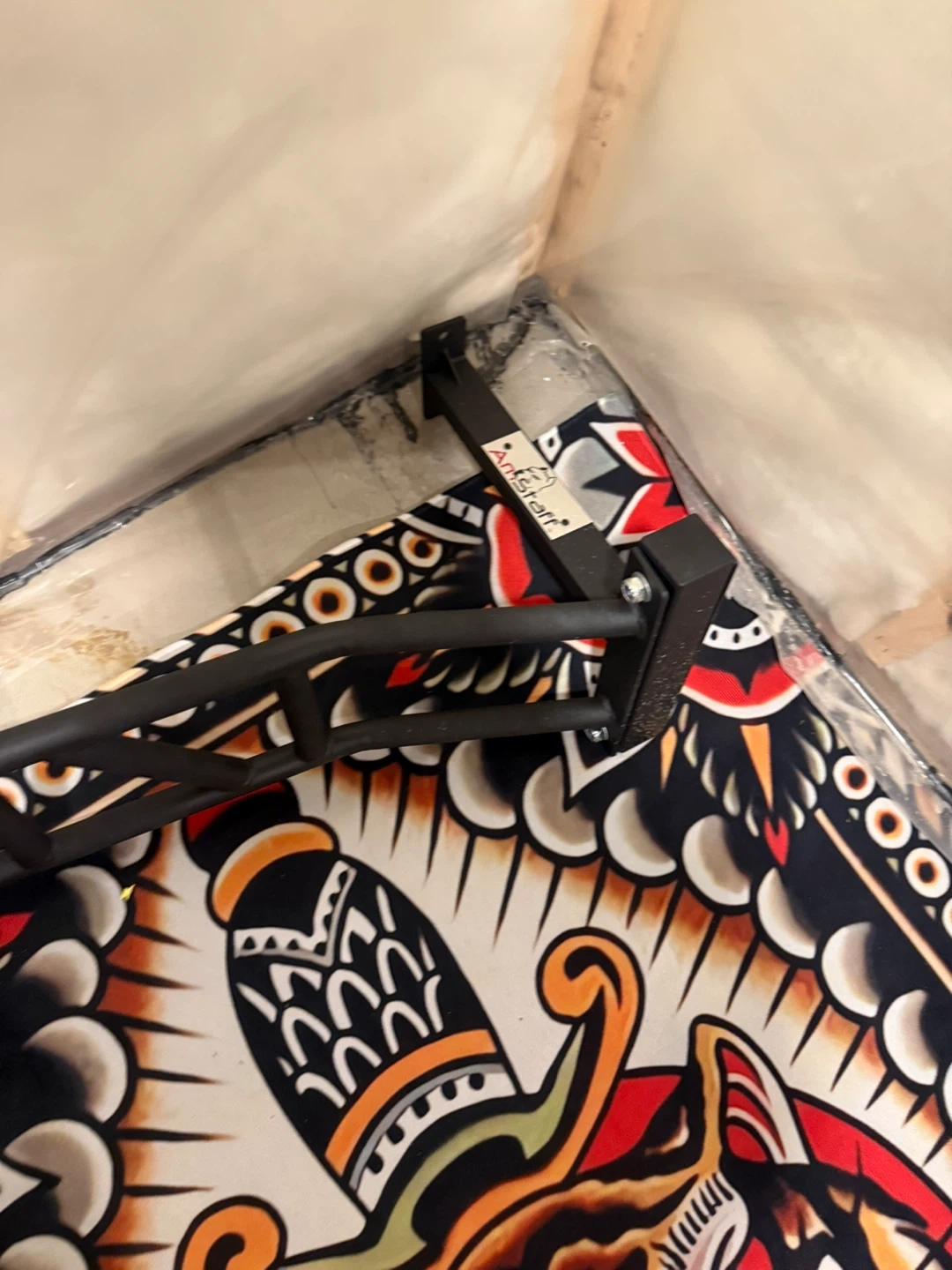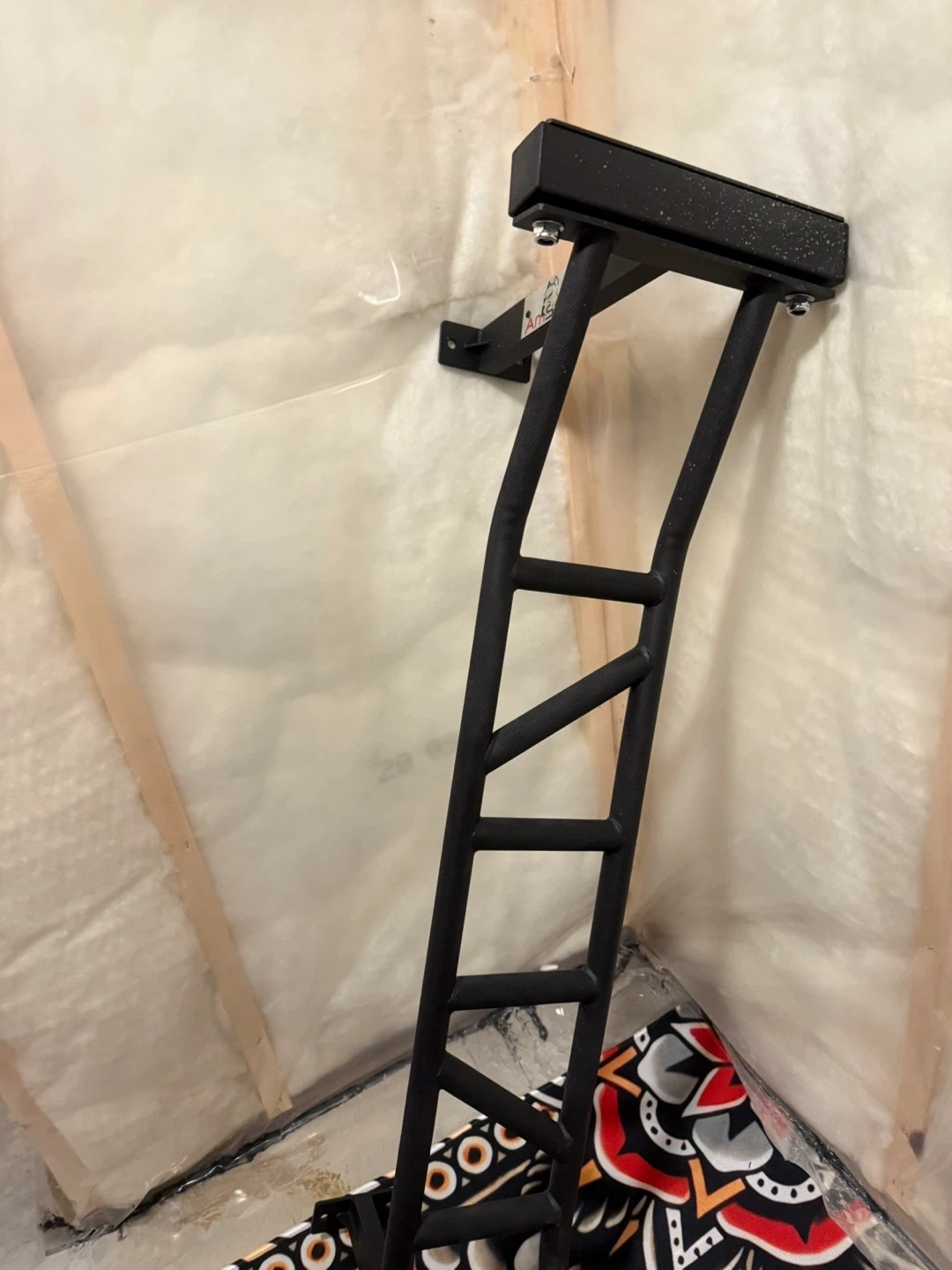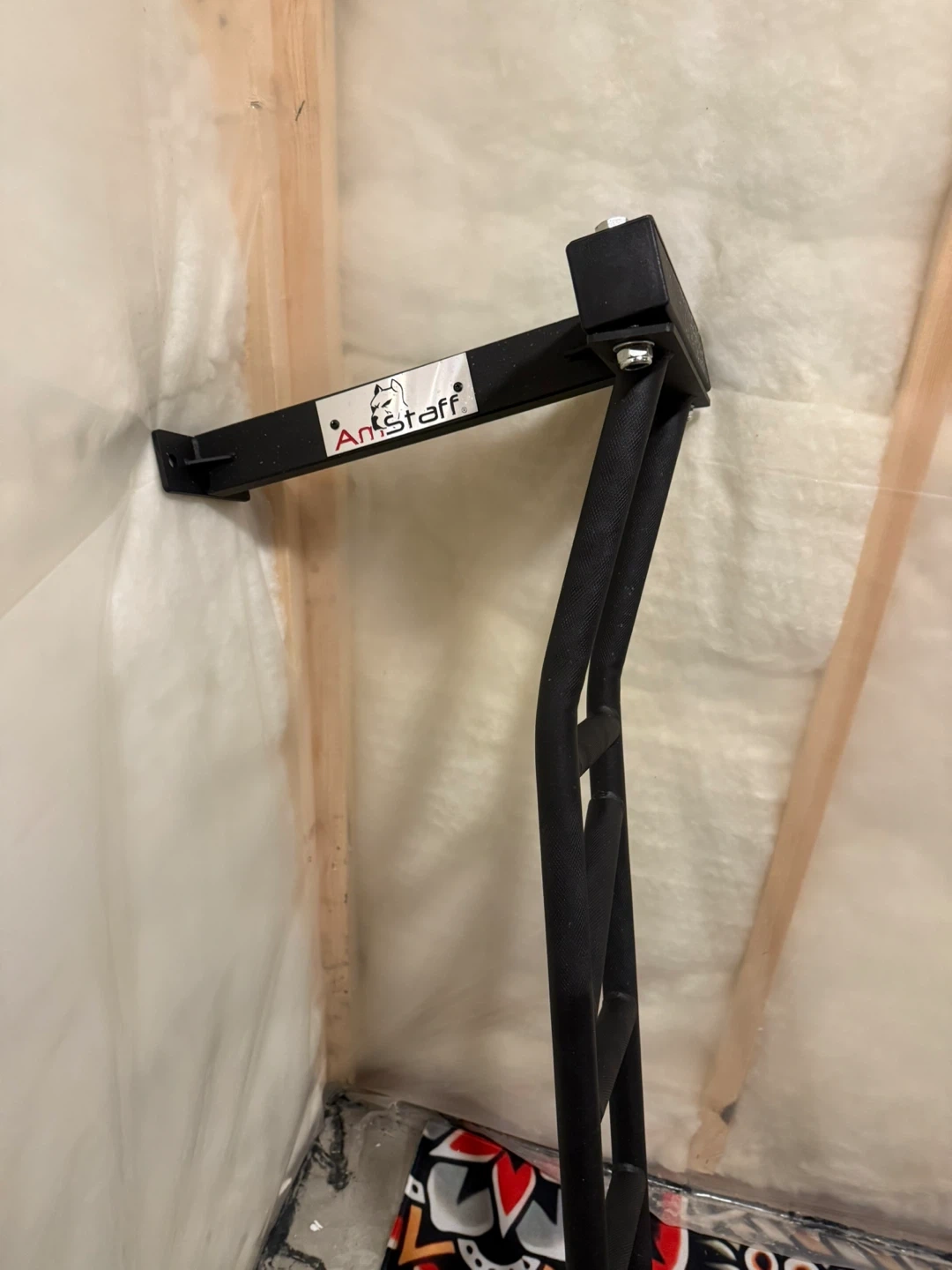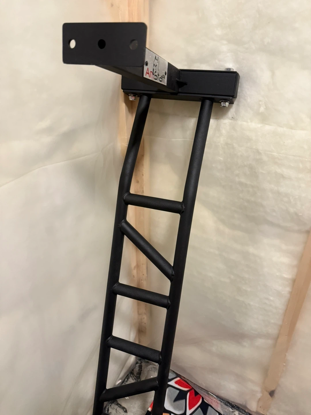 This is an AnStaff pull-up bar designed for home workouts. It's made of durable black metal. It's perfect for building upper body strength. It mounts to roof joists , heavy duty chin up bar . Does not come with lag bolts to mount.