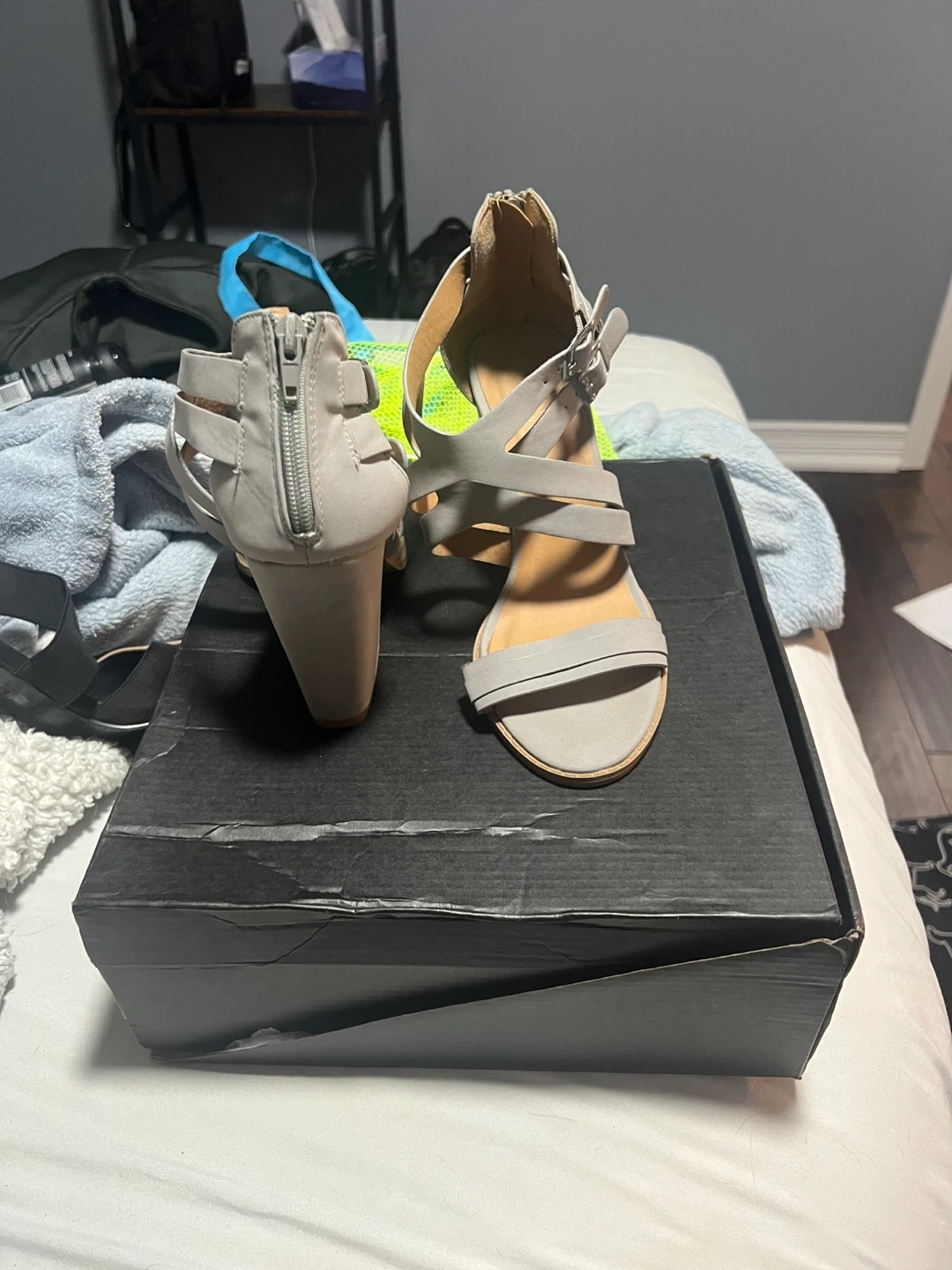 Torrid grey strappy wedge heels with an ankle strap and zipper closure. These shoes are a size 8. They're perfect for dressing up any outfit for a night out or special occasion!