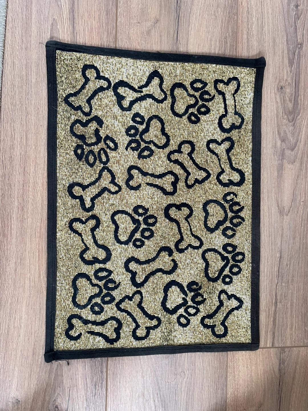 A patterned mat with dog bone and paw print designs. Features a woven texture and a black trim. It's useful for placing by a door or feeding station.