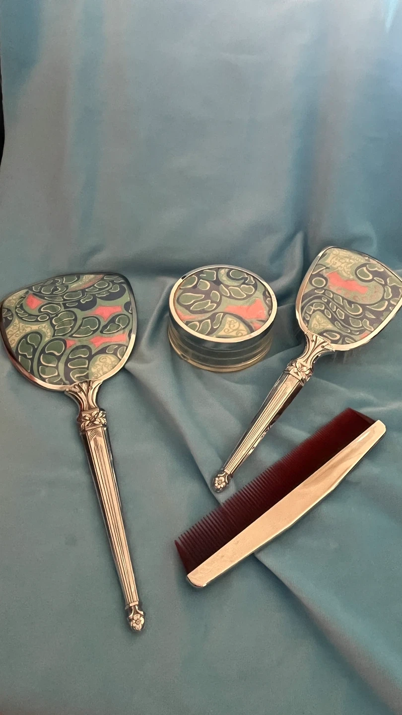 This vintage vanity set includes a hand mirror, a hairbrush, a comb, and a decorative powder case. Each piece features a stylish silver-toned handle and a colourful inlay with a retro pattern. The hairbrush has natural bristles.