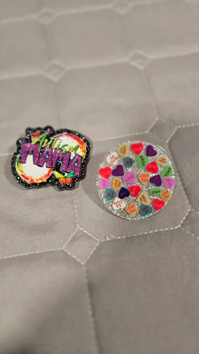 Set includes an 'Autism Mama' pins with a butterfly design and a round pins decorated with candy hearts. These pins are sparkly and colorful. They're great for expressing support and love!