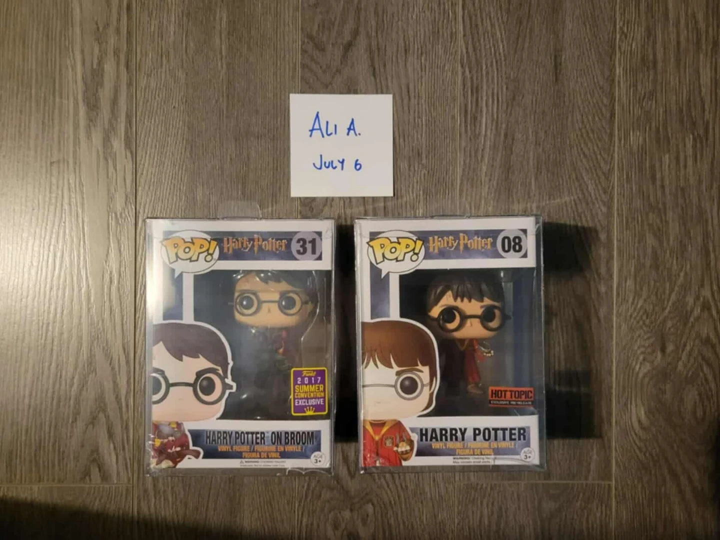 Two Funko Pop! vinyl figures from the Harry Potter series. Includes 'Harry Potter on Broom' (2017 Summer Convention Exclusive) and 'Harry Potter' (Hot Topic Exclusive). Figures are in their original boxes.