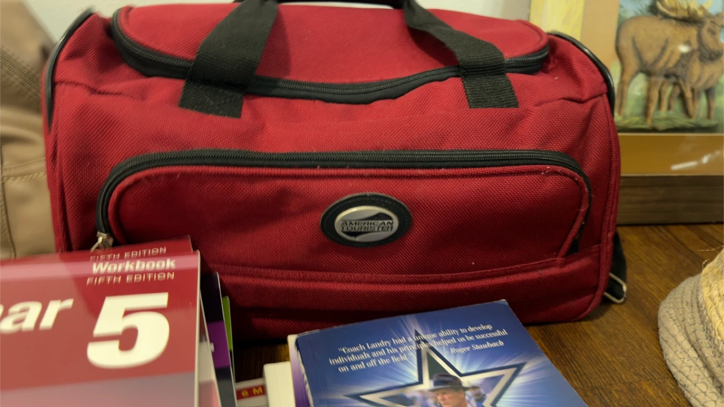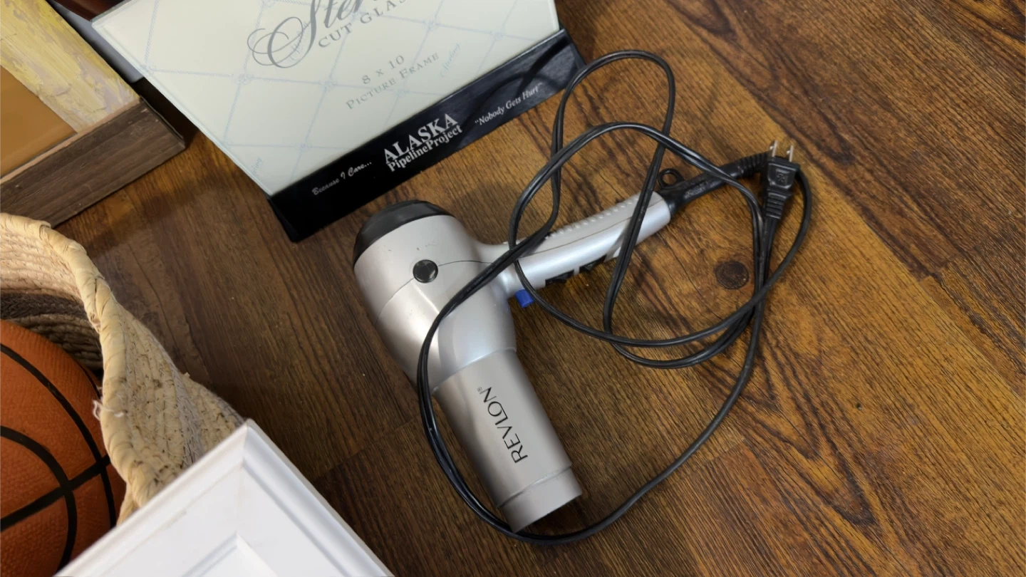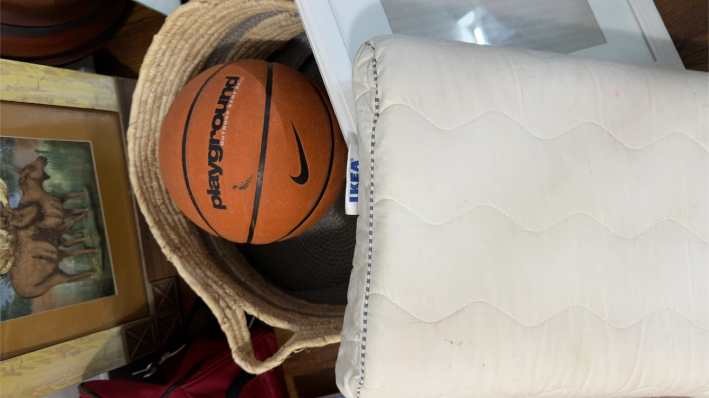 Gently used items for sale. Includes a working clock, a white picture frame, a basketball, some books, a red bag, a hair dryer, and a pillow. Some items have minor signs of use. All in 50$ (Moving sale)