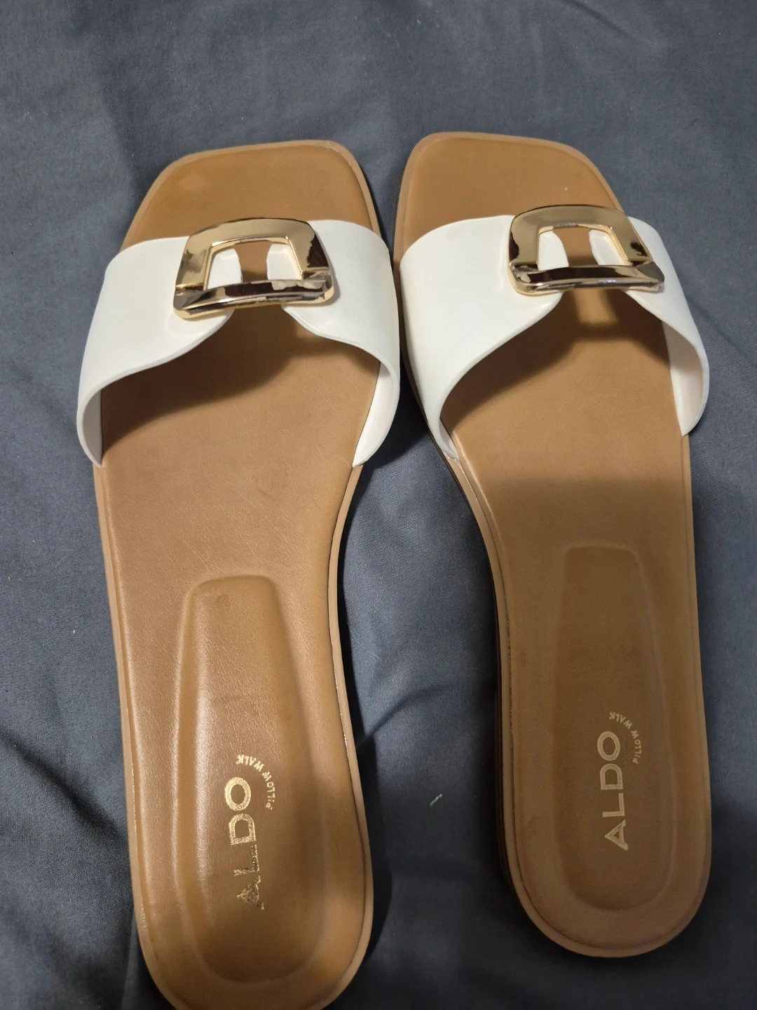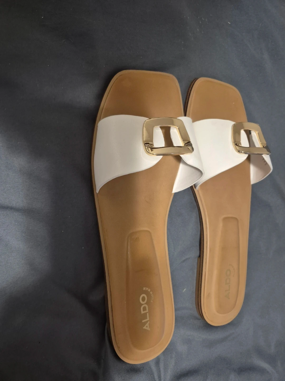 These ALDO slide sandals feature a chic white strap with a decorative gold buckle. The footbed is a warm tan colour. They're stylish and comfy for everyday wear! Size 10.5 to 11 if interested please call 647-834-5673 new with out tags never worn only tried on.