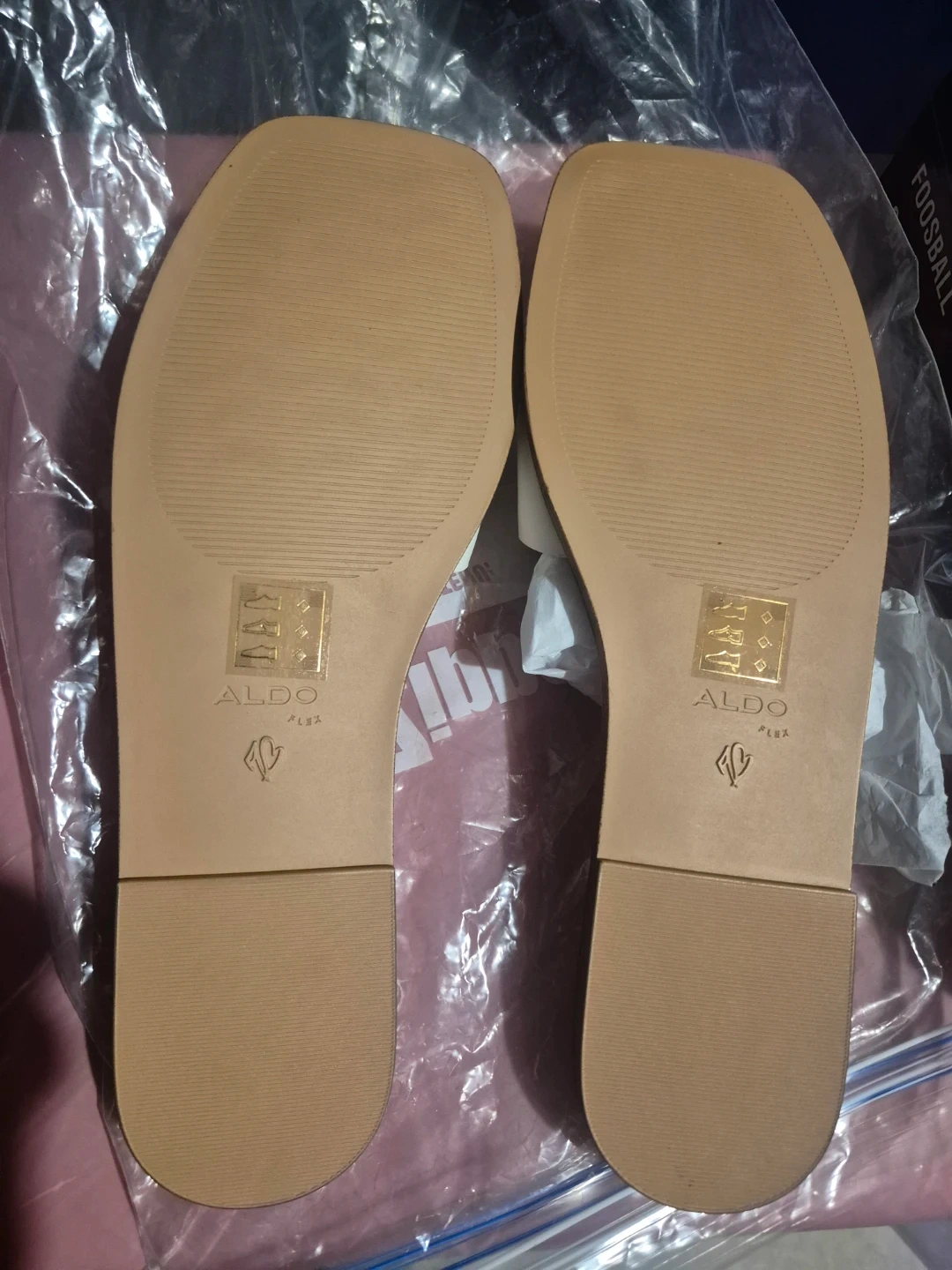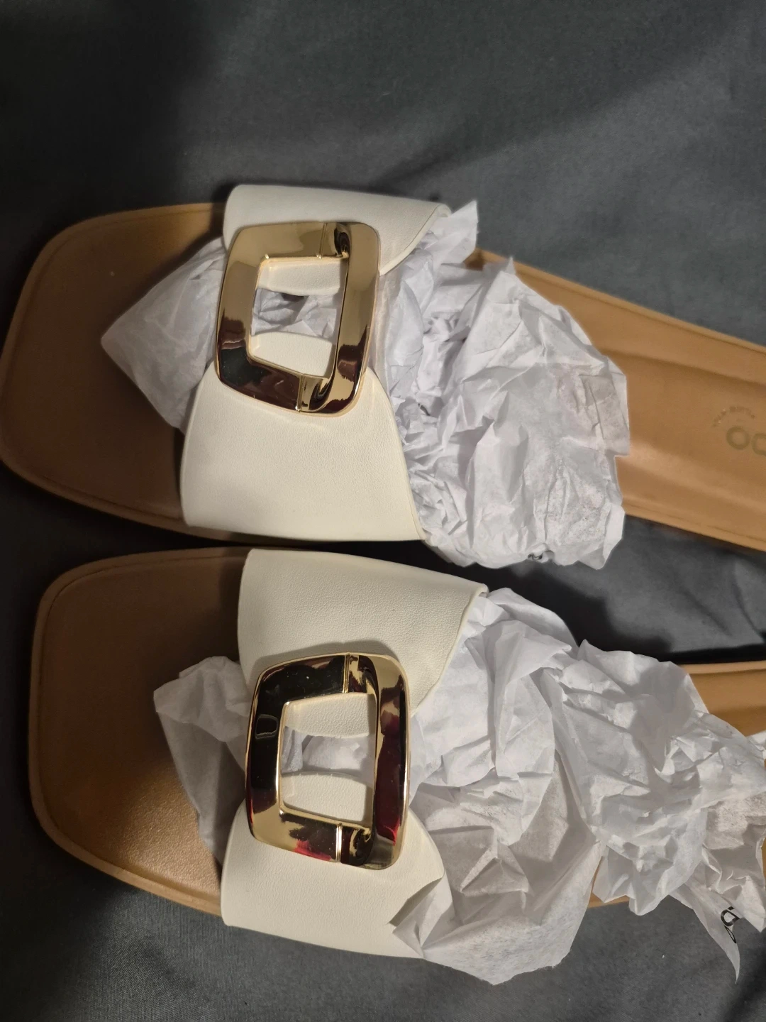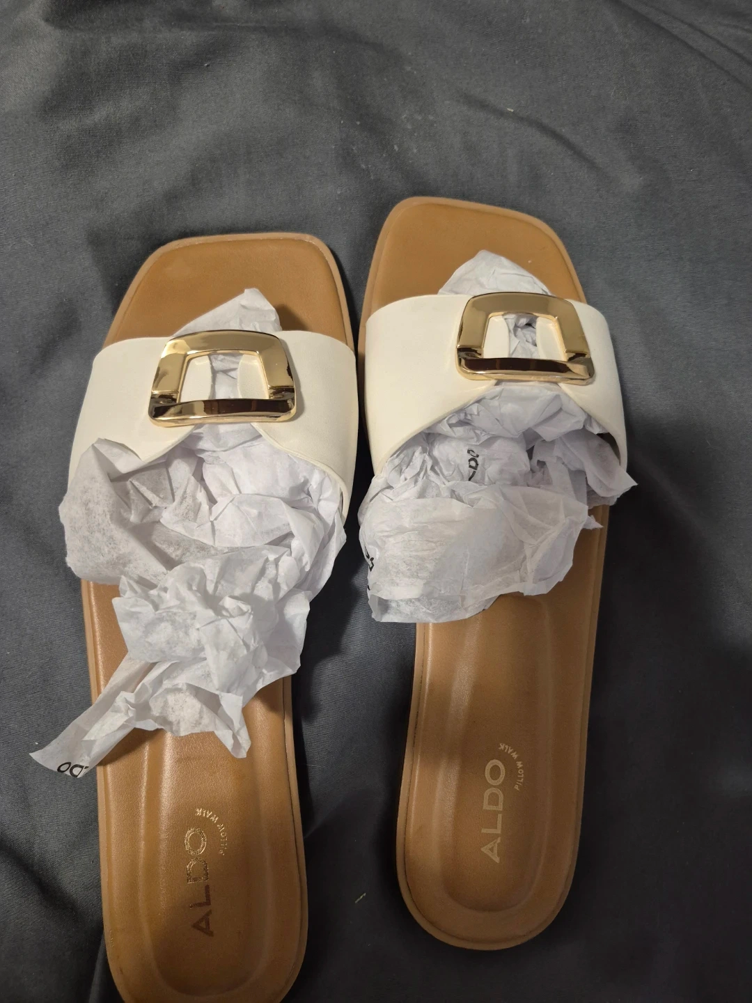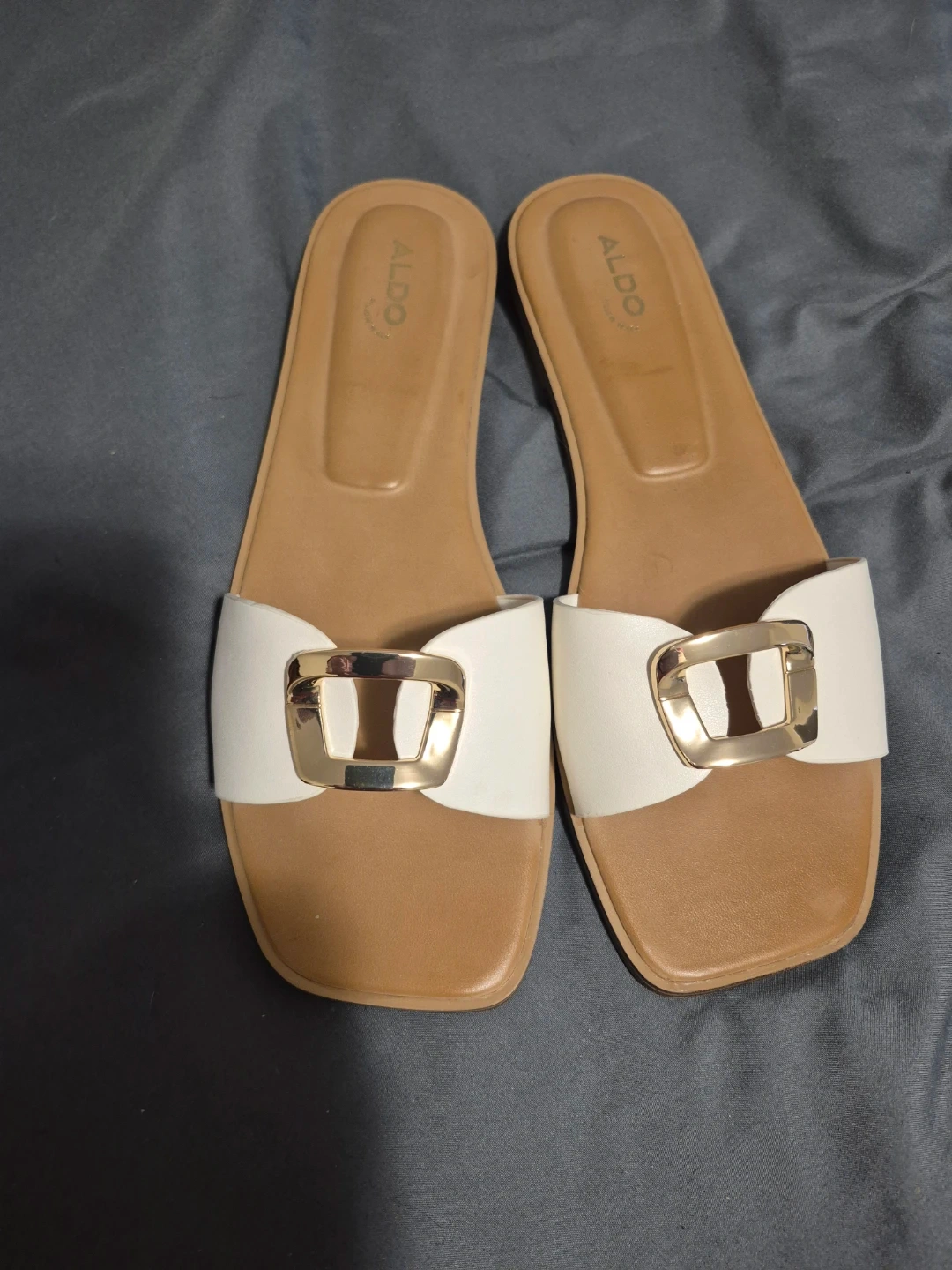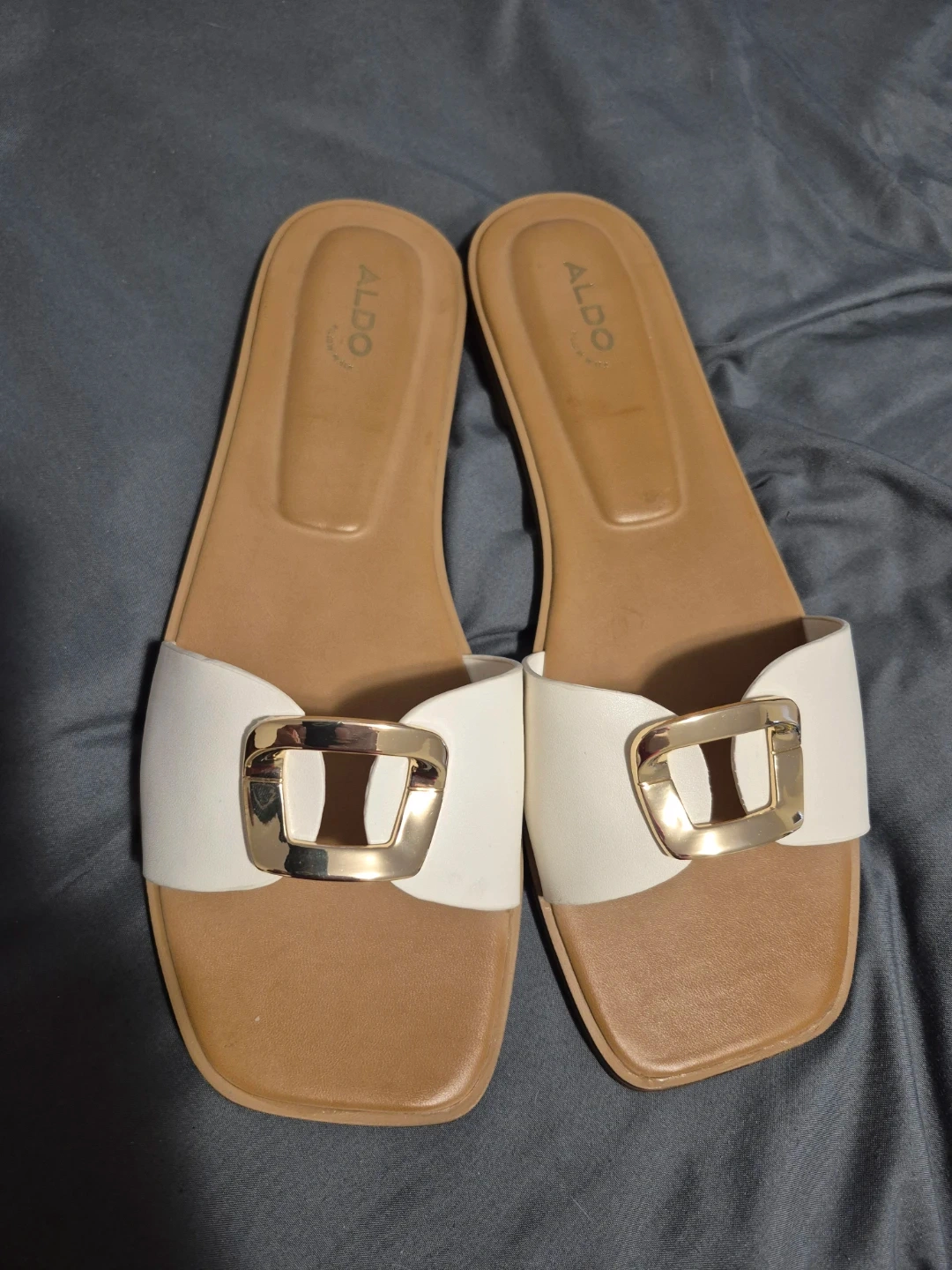 These ALDO slide sandals feature a chic white strap with a decorative gold buckle. The footbed is a warm tan colour. They're stylish and comfy for everyday wear! Size 10.5 to 11 if interested please call 647-834-5673 new with out tags never worn only tried on.