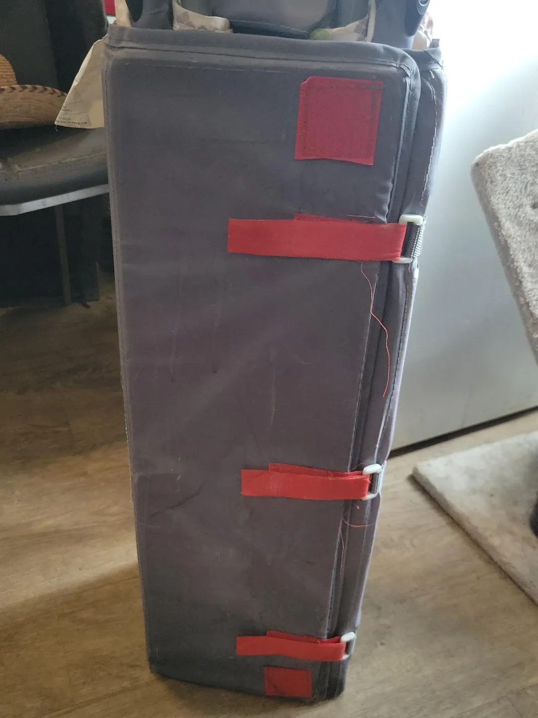A foldable play mat, perfect for giving your little one a soft space to explore. It's made from durable material and features secure straps to keep it folded.