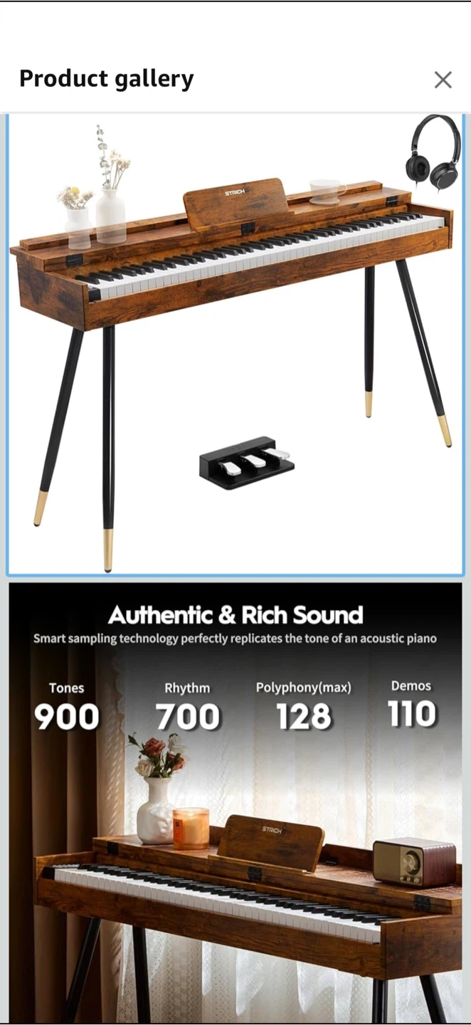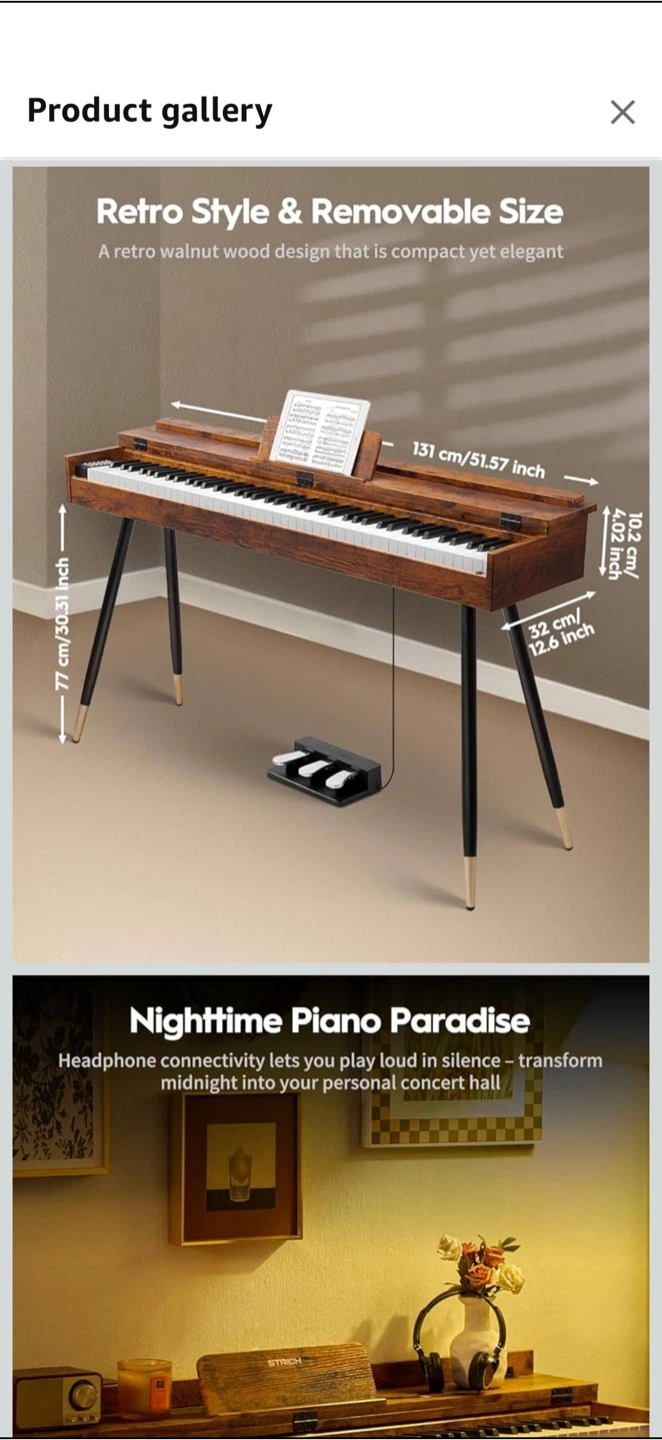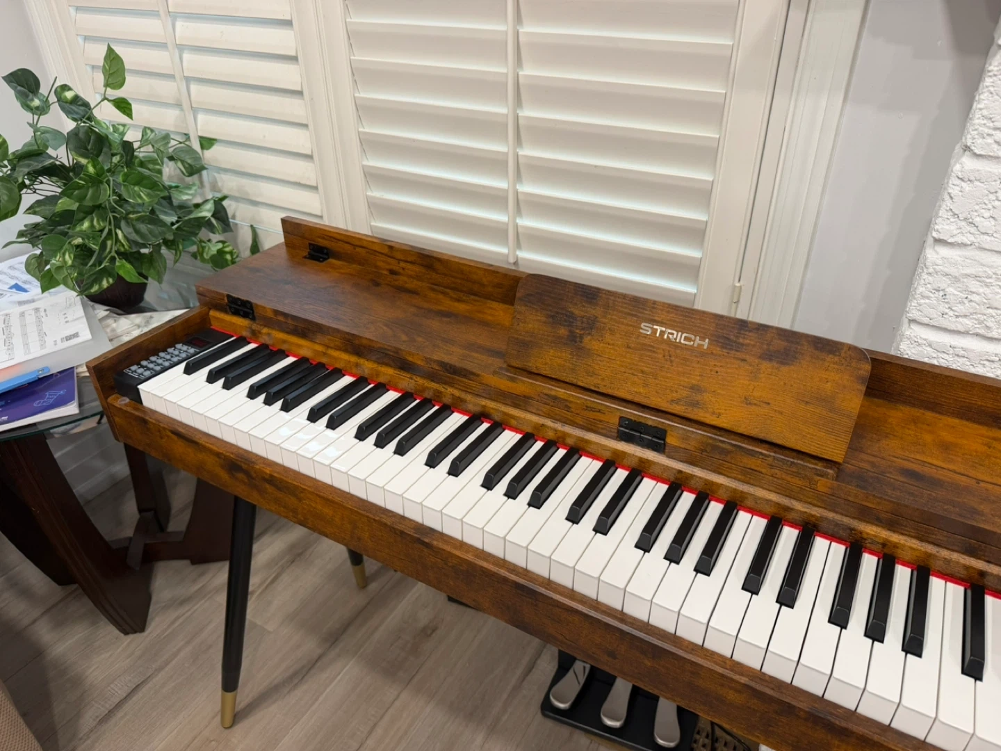 This is a STRICH digital piano with a retro wood finish. It measures 131 cm in length and 77 cm in height. It features hammer action keys and stereo surround sound speakers.