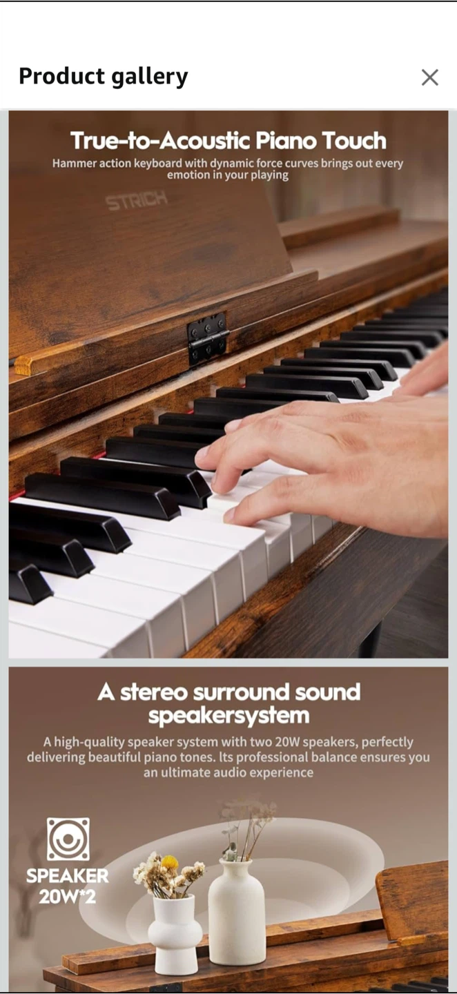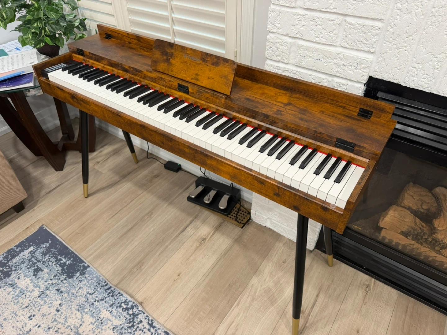 This is a STRICH digital piano with a retro wood finish. It measures 131 cm in length and 77 cm in height. It features hammer action keys and stereo surround sound speakers.