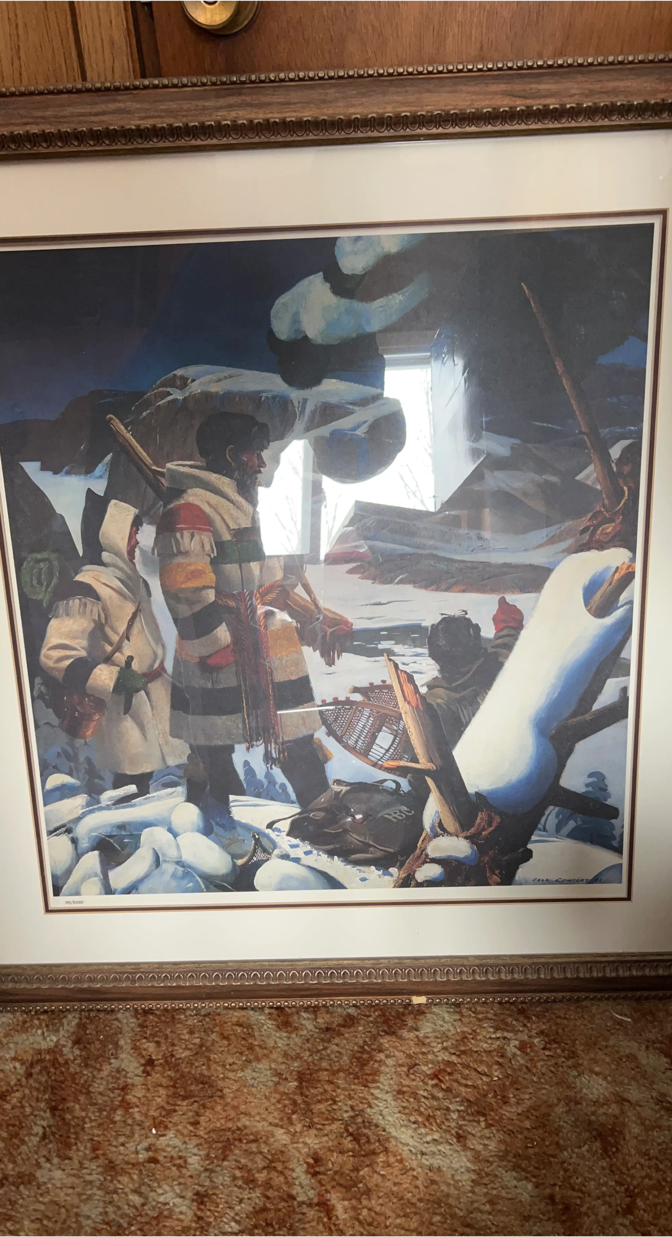 This framed print depicts "The Fur Traders" scene by artist Chas. Contartesi. It's a limited edition print, numbered 145/5000. The artwork captures a historic winter setting with figures in traditional winter clothing and snowshoes.have certificates for this item