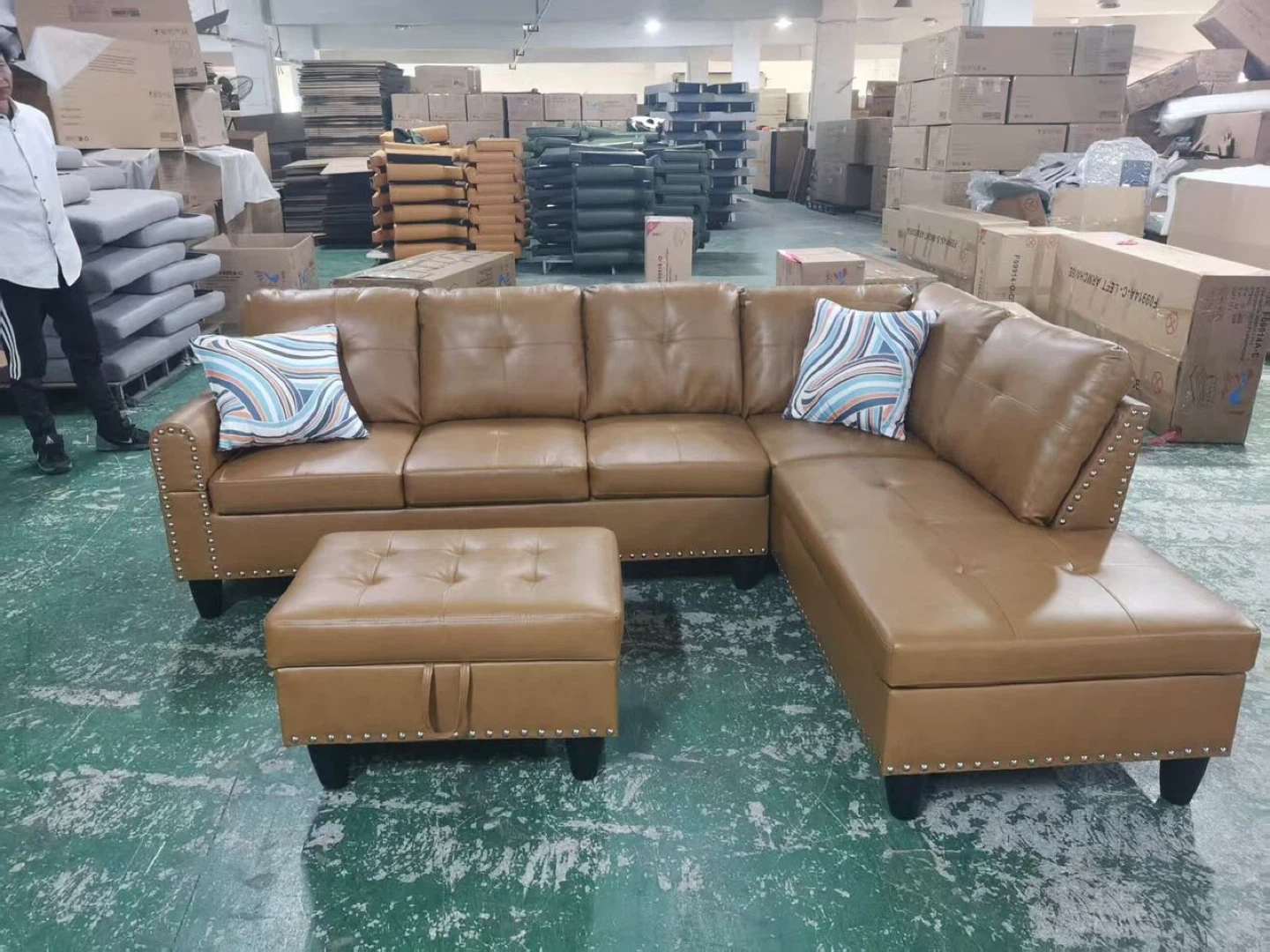 This brown premium air leather sectional sofa includes a matching tufted ottoman with storage. It's upholstered with nailhead trim details and comes with two decorative pillows. The ottoman also has a pull-tab for easy access to its storage compartment.