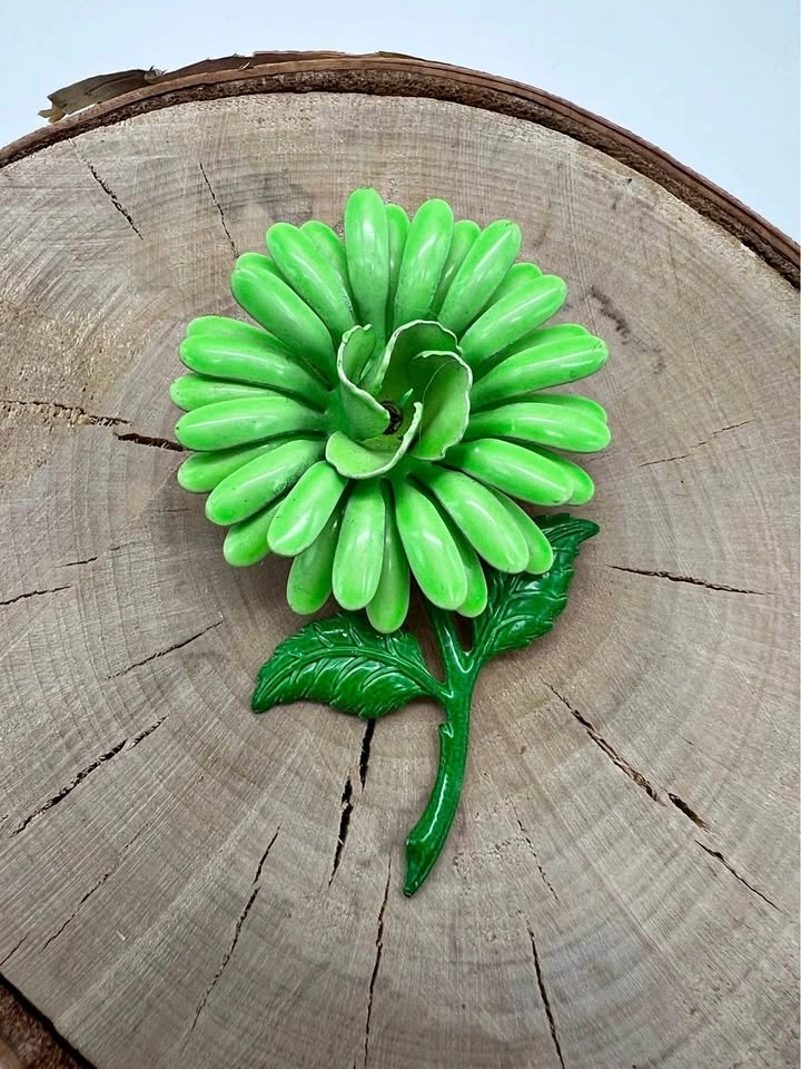Bold lime green enamel flower brooch with glossy petals and detailed green leaves—such a fun retro statement piece!