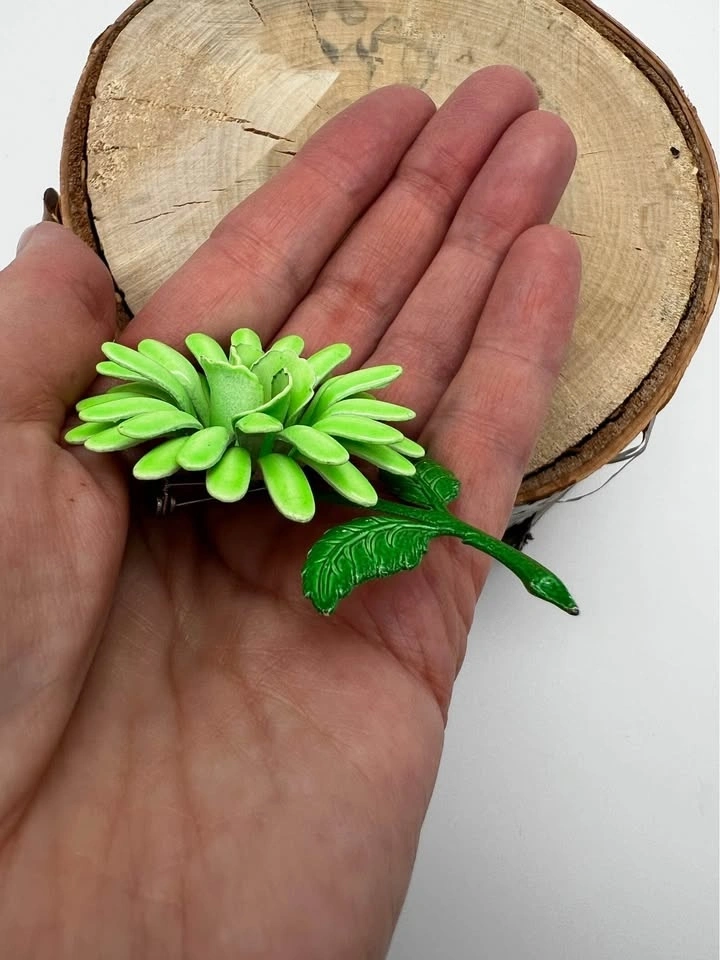 Bold lime green enamel flower brooch with glossy petals and detailed green leaves—such a fun retro statement piece!