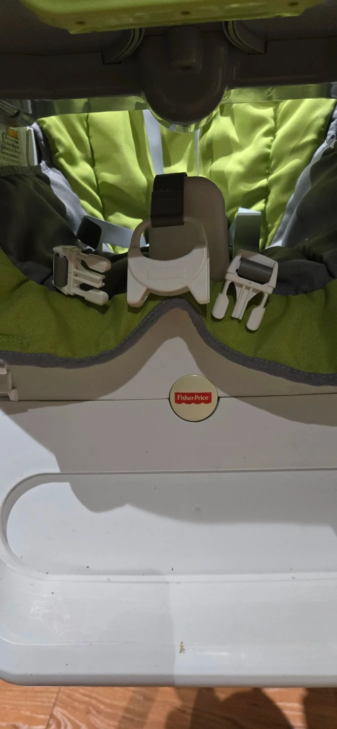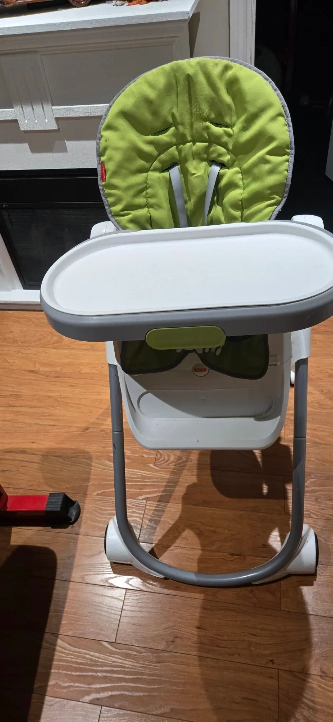 Fisher-Price high chair with a green and grey padded seat. Features a removable tray and a 5-point harness system. Easy to wipe down and clean. Seat height can also be adjusted.