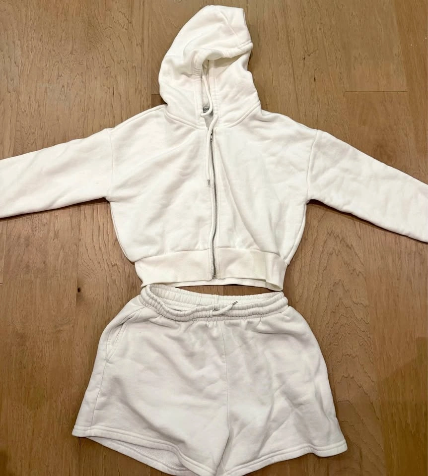 Fashion Nova white cropped sweater and short set, size small. Worn once for wedding getting ready photos. Small mark on right sleeve. Pickup in Amherstburg.