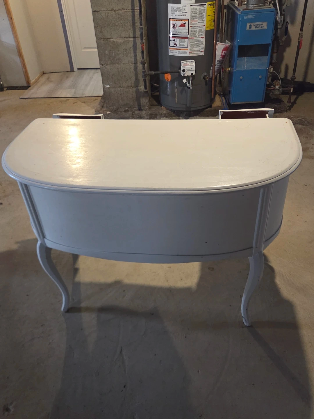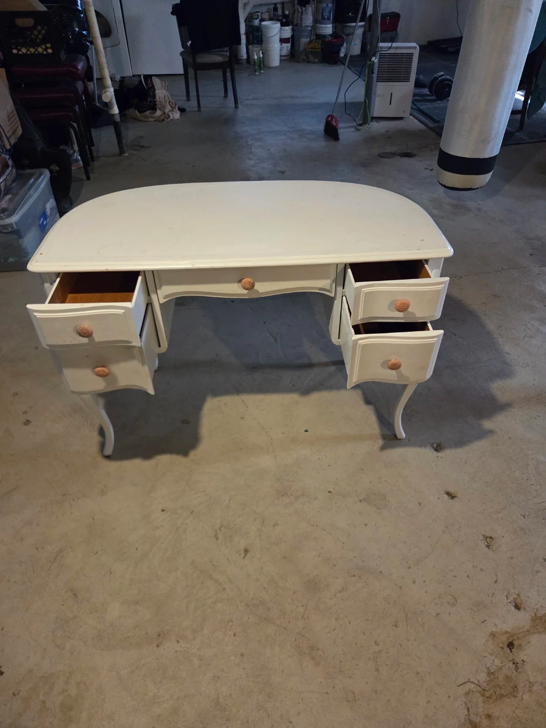 This white vanity desk features a large oval mirror and multiple drawers for storage. It has elegant curved legs and light-colored knobs. It's a charming piece for a bedroom.