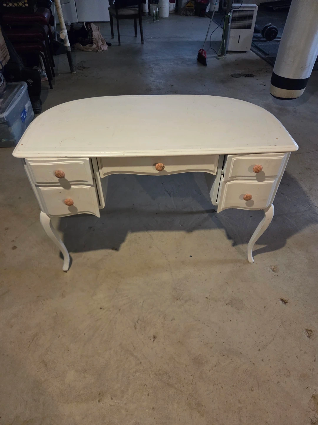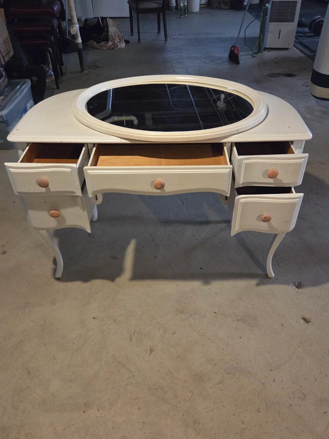 This white vanity desk features a large oval mirror and multiple drawers for storage. It has elegant curved legs and light-colored knobs. It's a charming piece for a bedroom.