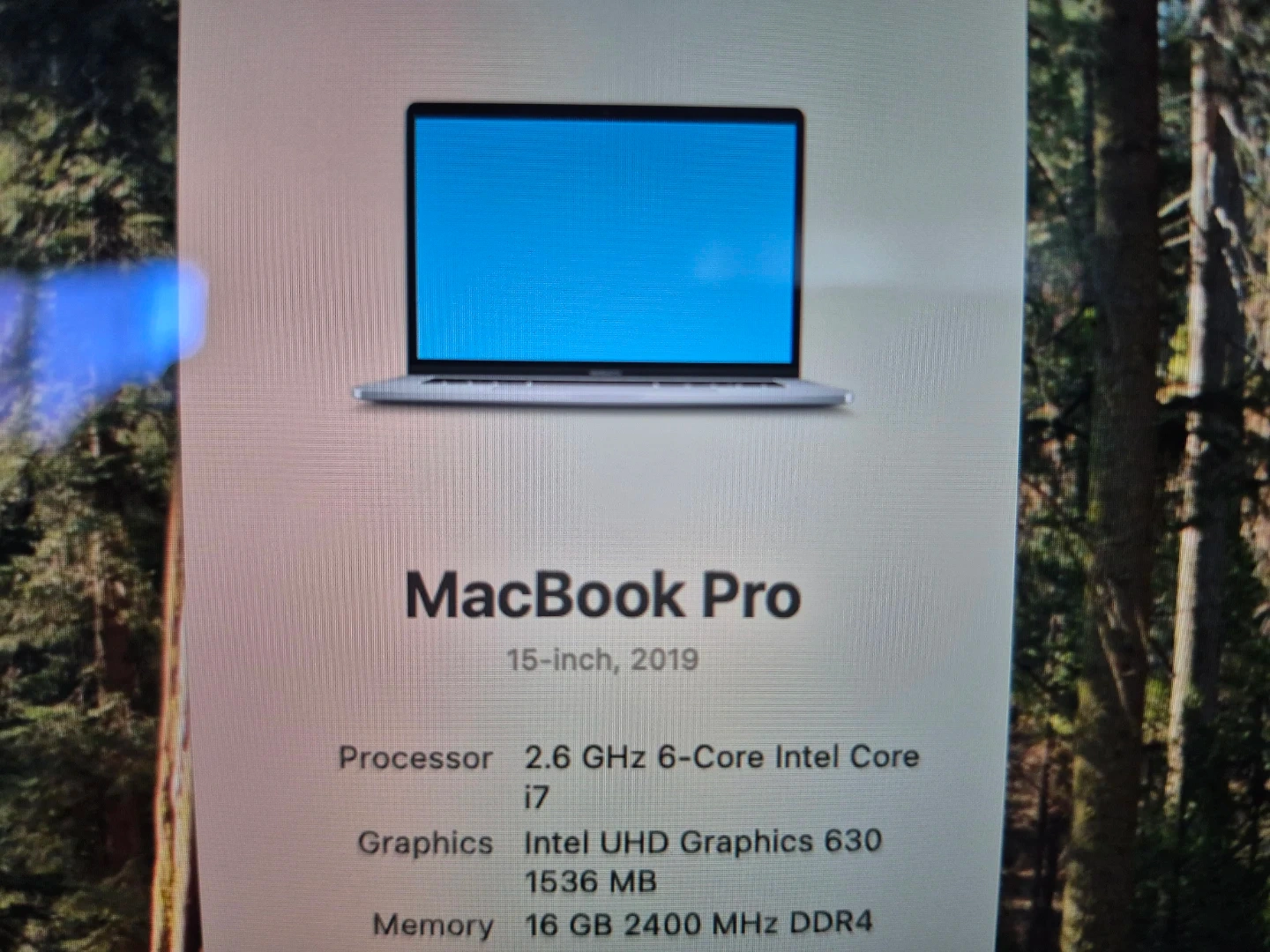 This MacBook Pro is a 15-inch model from 2019. It features a 2.6 GHz 6-Core Intel Core i7 processor and 16 GB RAM. The display is a 15.4-inch Retina. Storage is 250 GB. With touchbar