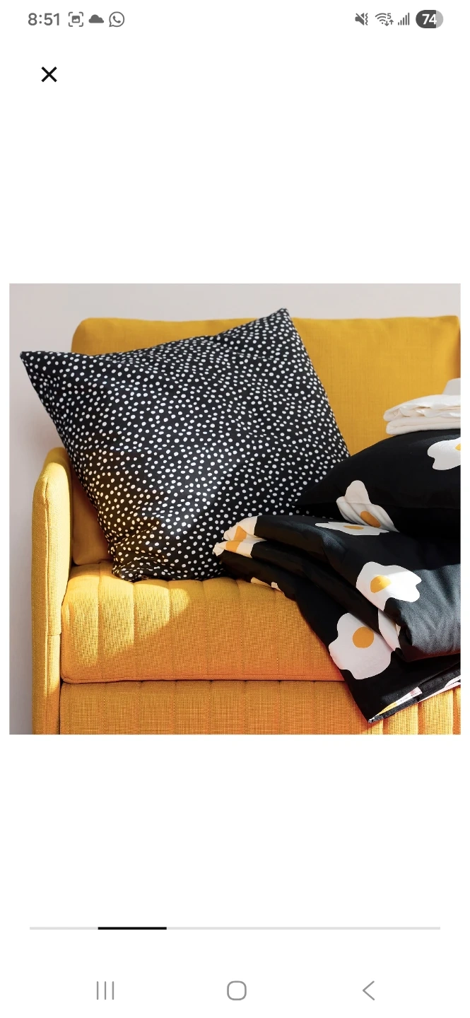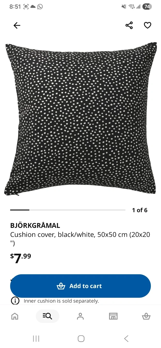 This is the IKEA BJÖRKGRÄMAL cushion cover. It's black and white with a speckled dot pattern. The dimensions are 50x50 cm (20x20 ").