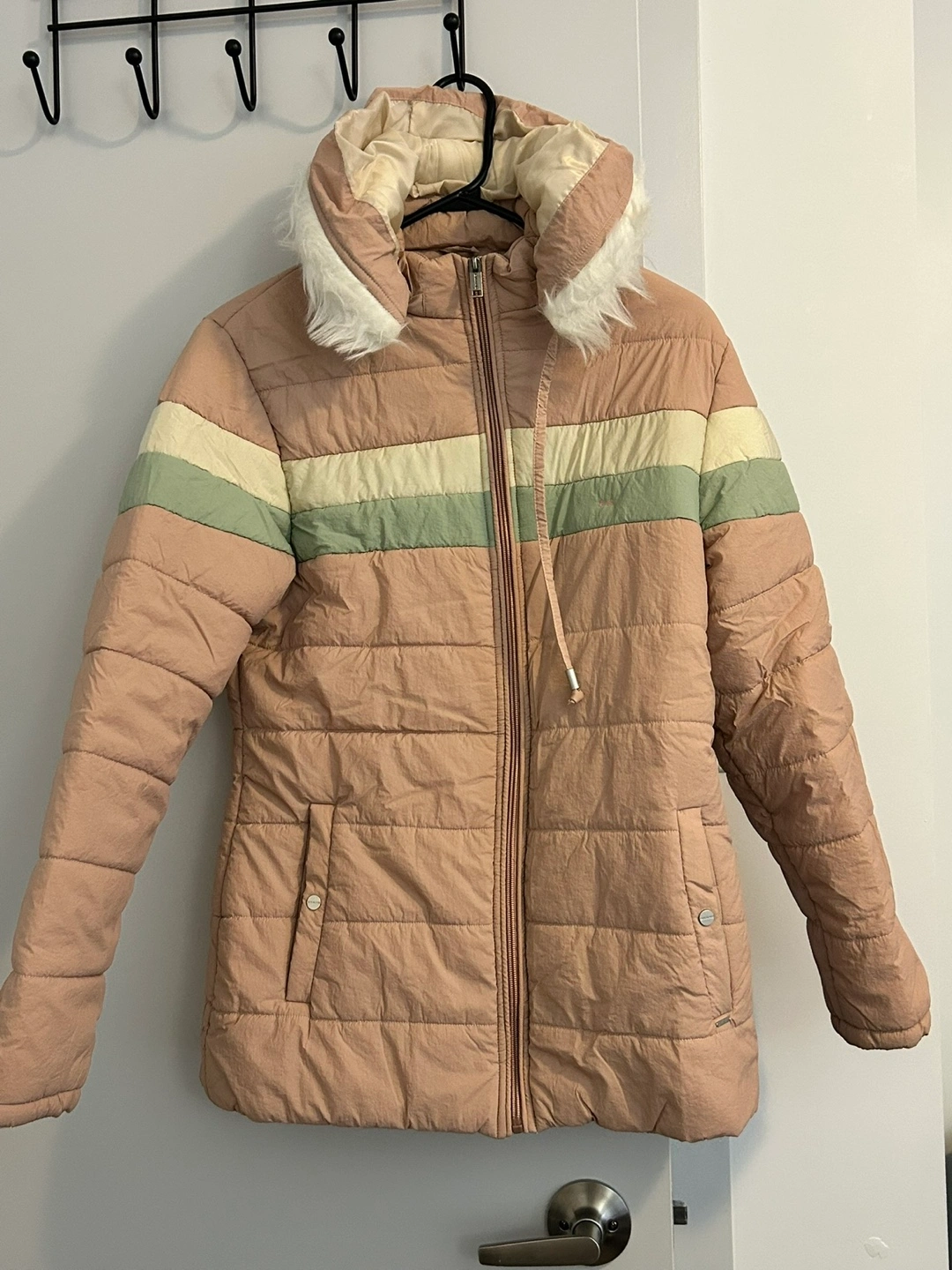 Selling a cute puffer jacket in a lovely pink colour. It has a striped design across the chest with cream, green and yellow. Perfect for staying warm!