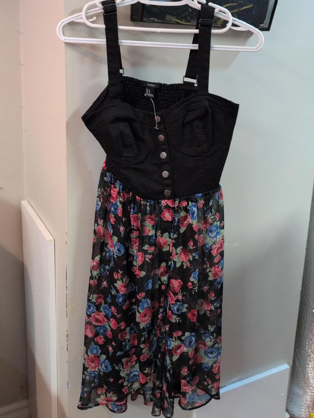 This black jumpsuit from Forever 21 features a denim-like bodice with silver button details. It has a smocked back for a comfortable fit. The wide-leg pants have a sheer black fabric with a vibrant floral print. Straps are adjustable.