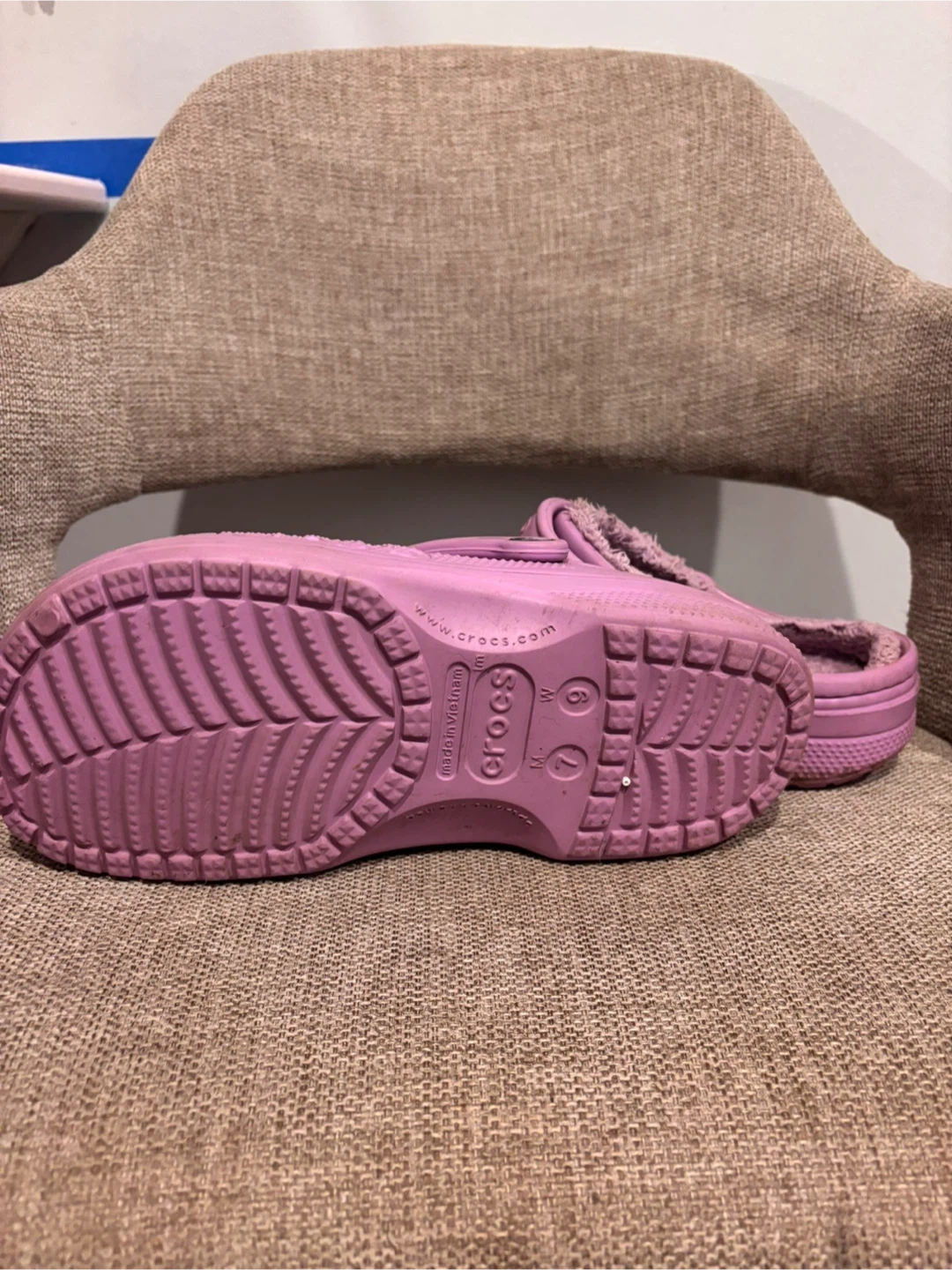 These purple Crocs feature a cozy fleece lining for extra warmth. They are a size 9. Perfect for keeping your feet toasty on cooler days!