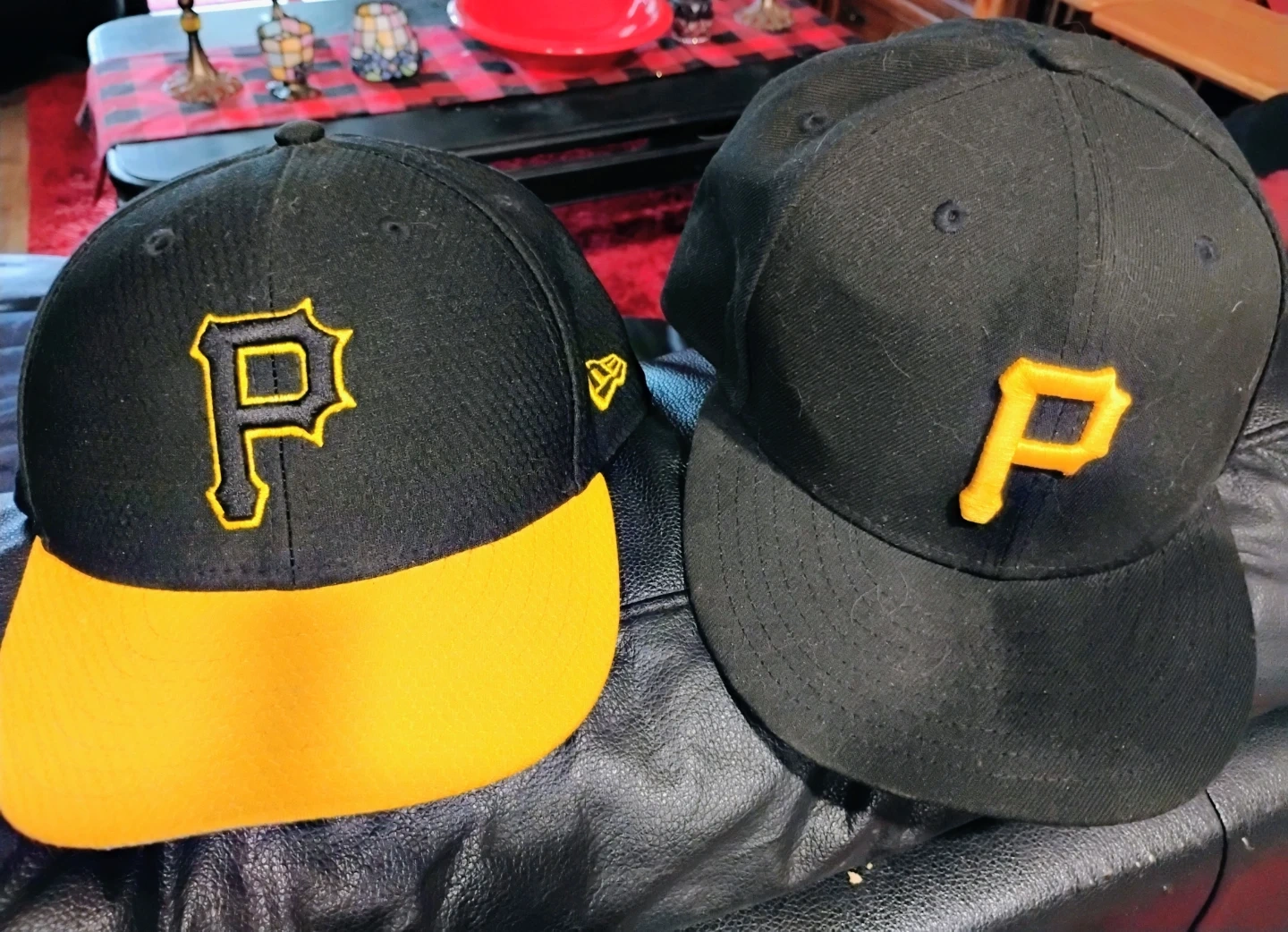 Two New Era Pittsburgh Pirates baseball caps. Both are black with yellow 'P' logo. One has a yellow brim. Fabric is polyester.