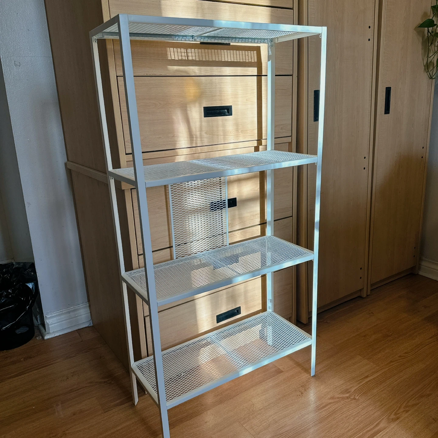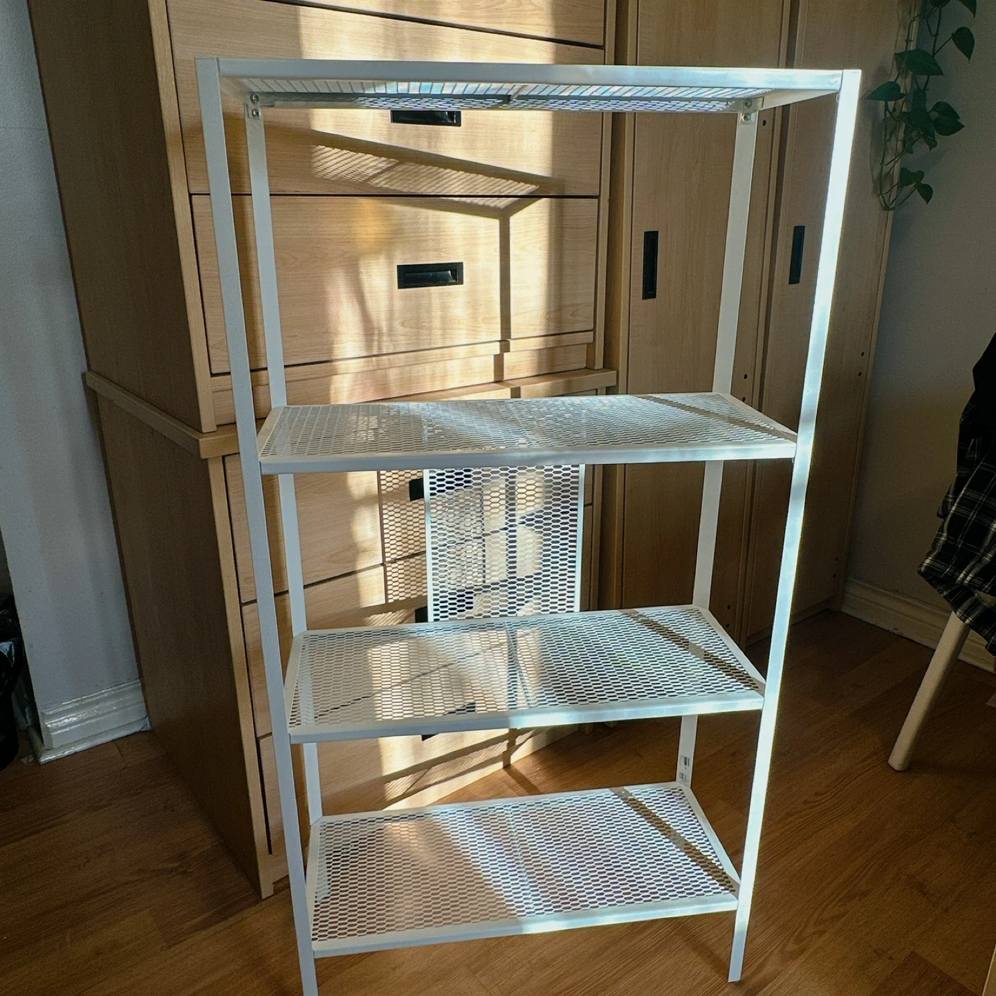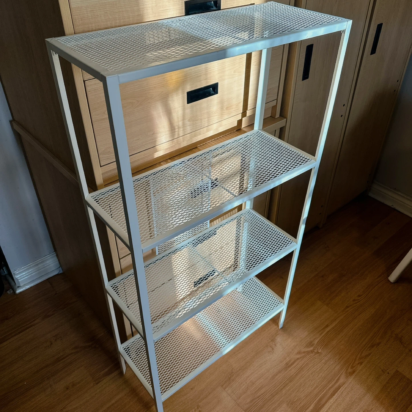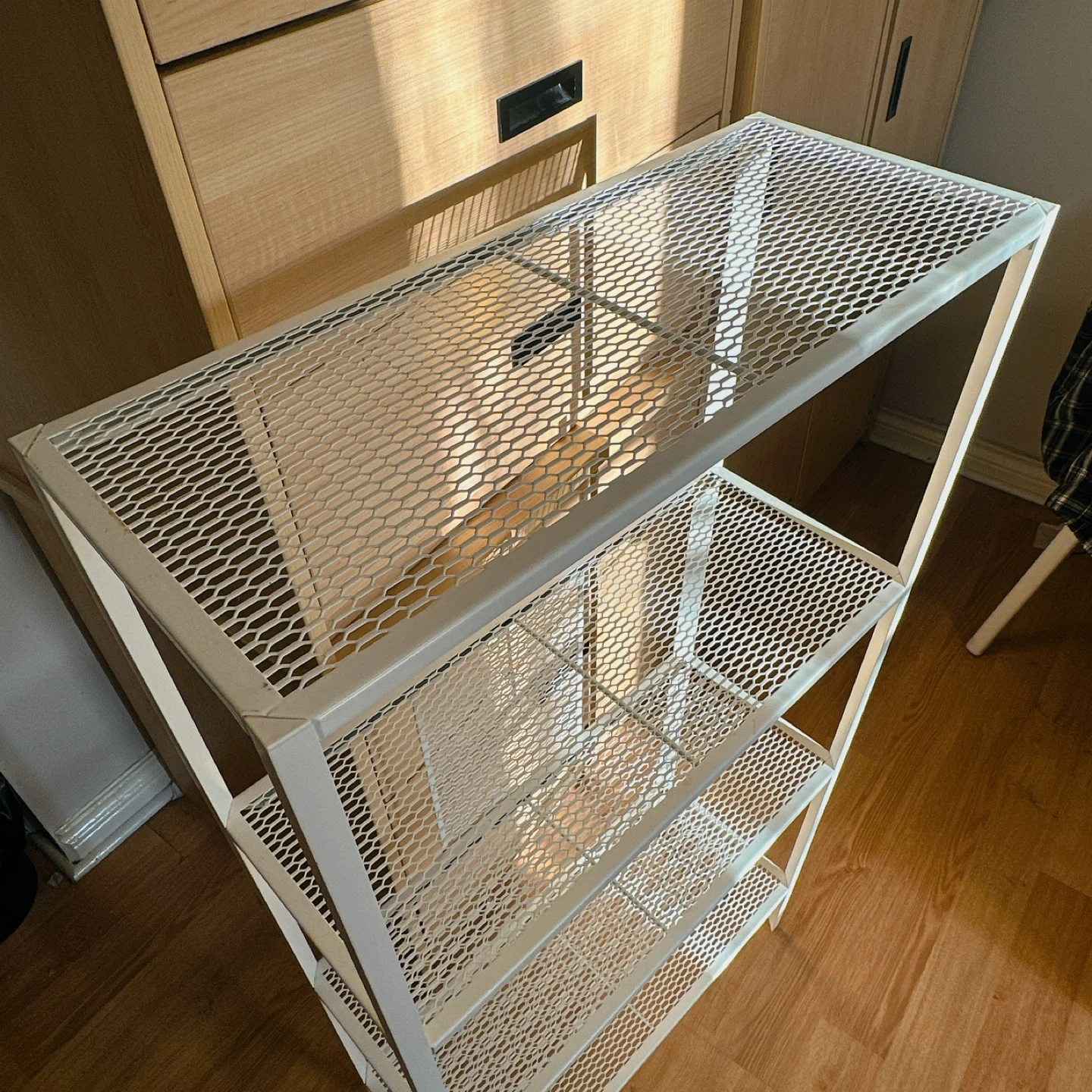 This is a white 4-tier metal shelf unit with a mesh design. It's made of metal and is great for storage. This unit is approximately 5 feet tall