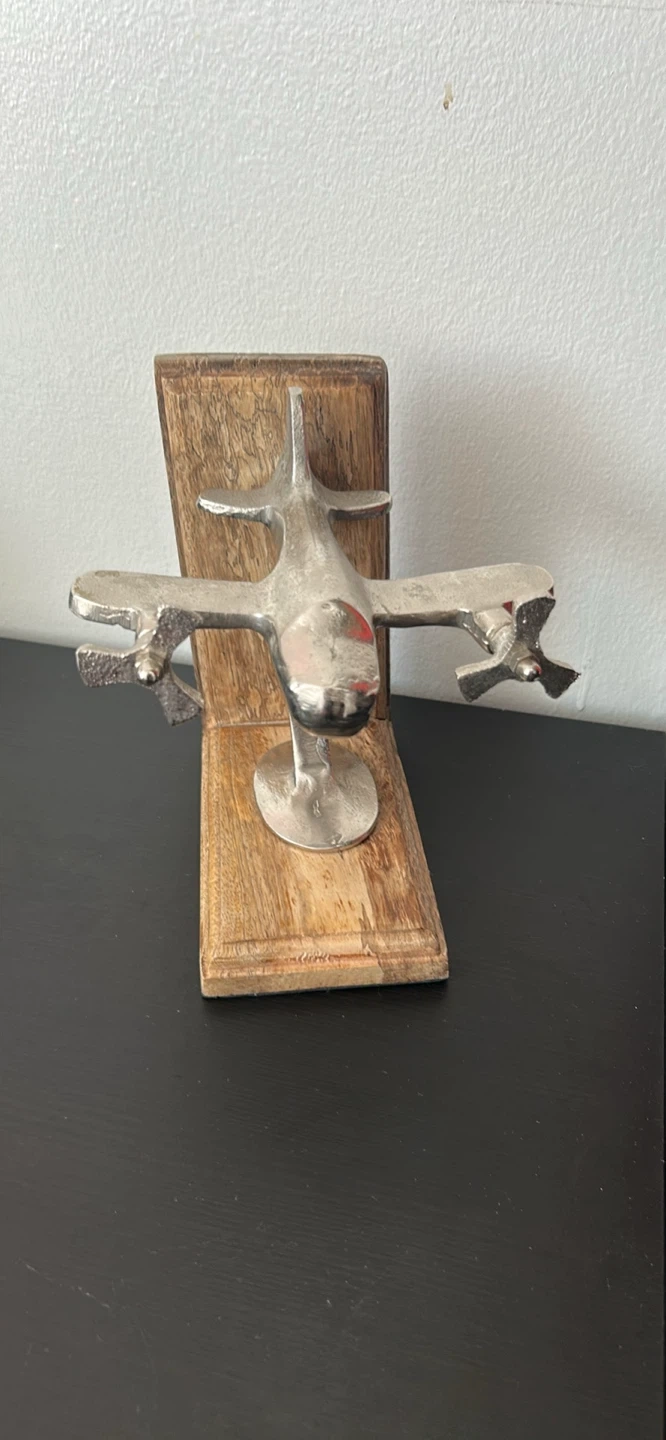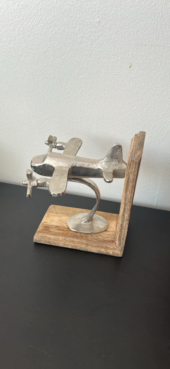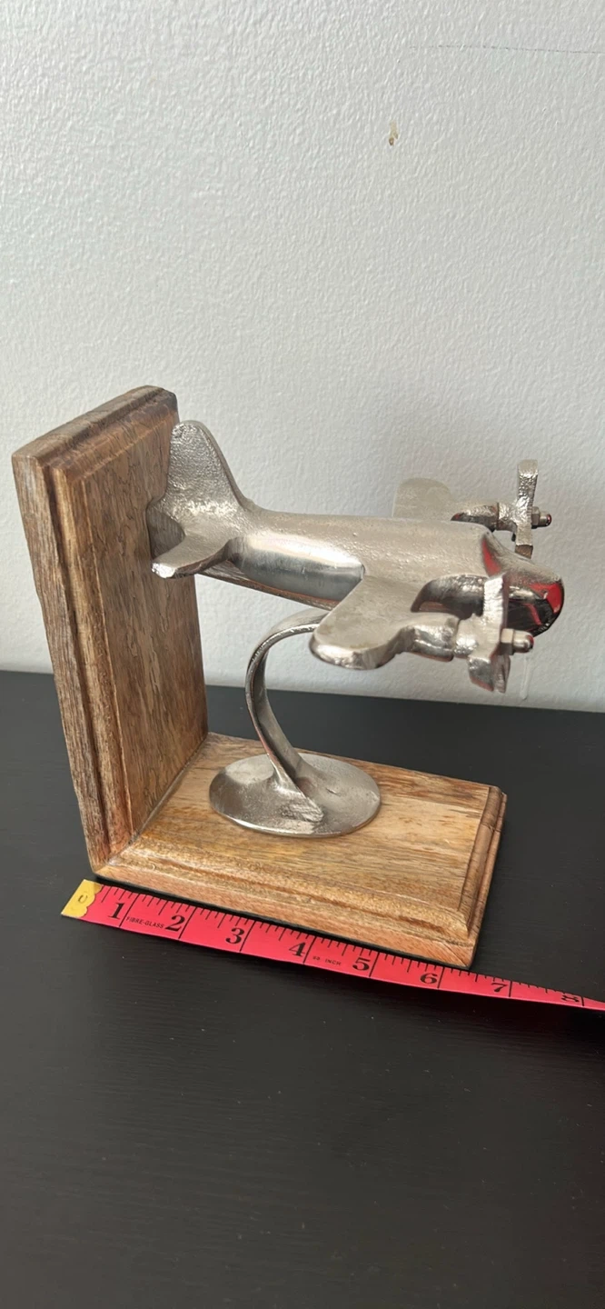 This decorative bookend features a metal airplane mounted on a rustic wooden base. It's designed to hold books upright on a shelf.