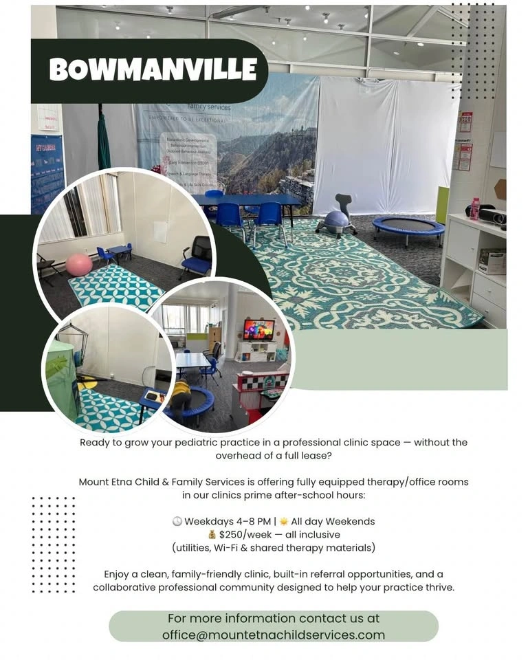 Looking for a professional space to grow your practice without committing to a full lease? Mount Etna Child & Family Services is reintroducing our fully equipped clinic rooms in central Durham & Toronto — perfect for SLPs, OTs, tutors, music teachers, and allied professionals. $250/week – ALL INCLUSIVE (utilities, Wi-Fi & shared therapy materials). Prime after-school hours: 4–8 PM weekdays + all day Sunday. Built-in referral opportunities, caseload share & collaborative environment. Comfortable parent lounge in every clinic. Clean, child-friendly, professional setting. Open and flexible to schedule and negotiations. Feel free to message if you have any questions!
