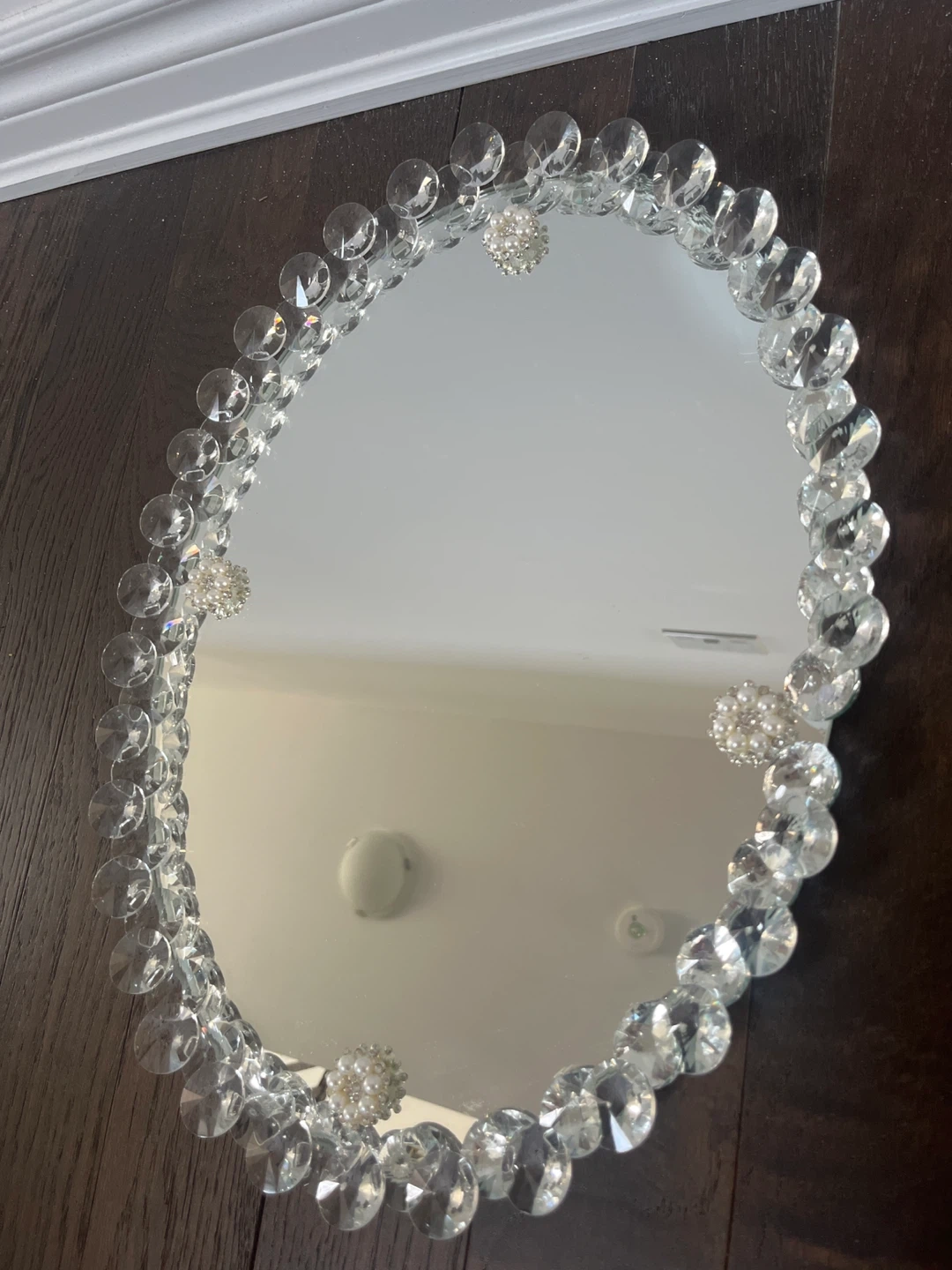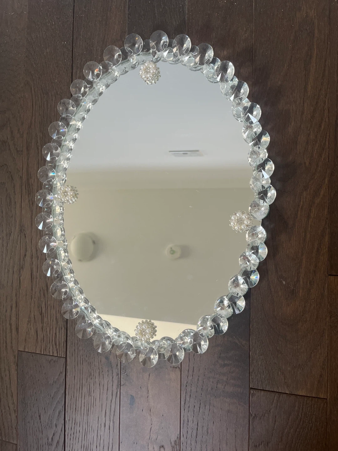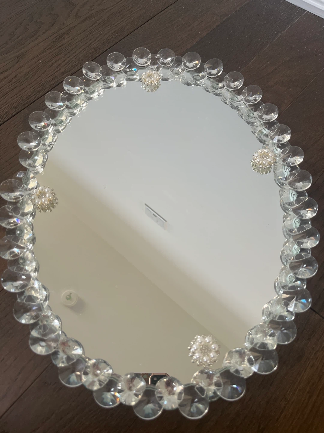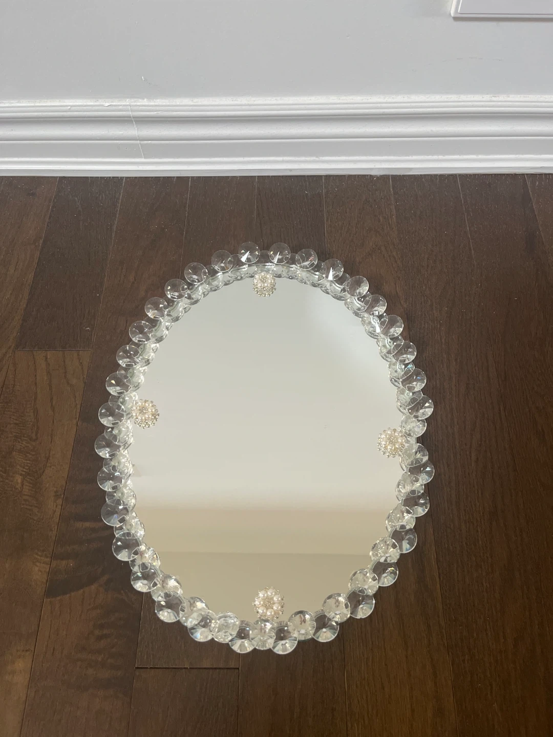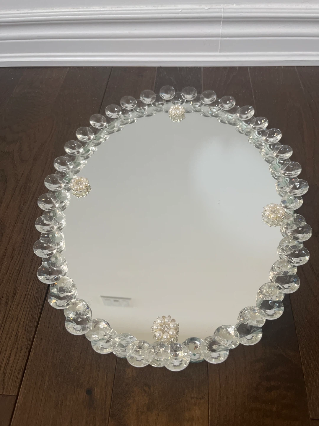This is an oval vanity tray with a mirrored surface. Its measurements are 34 cm in width and 42 cm in length. It's decorated with clear acrylic beads and pearl accents around the edge. The tray has four clear crystal-like feet for stability.pet and smoke free 🏡 new never used
